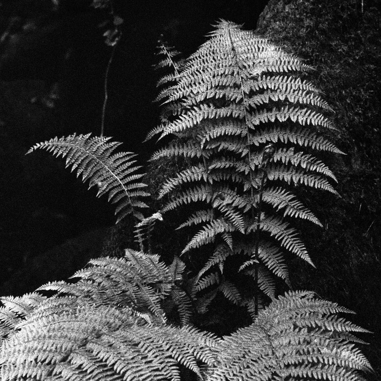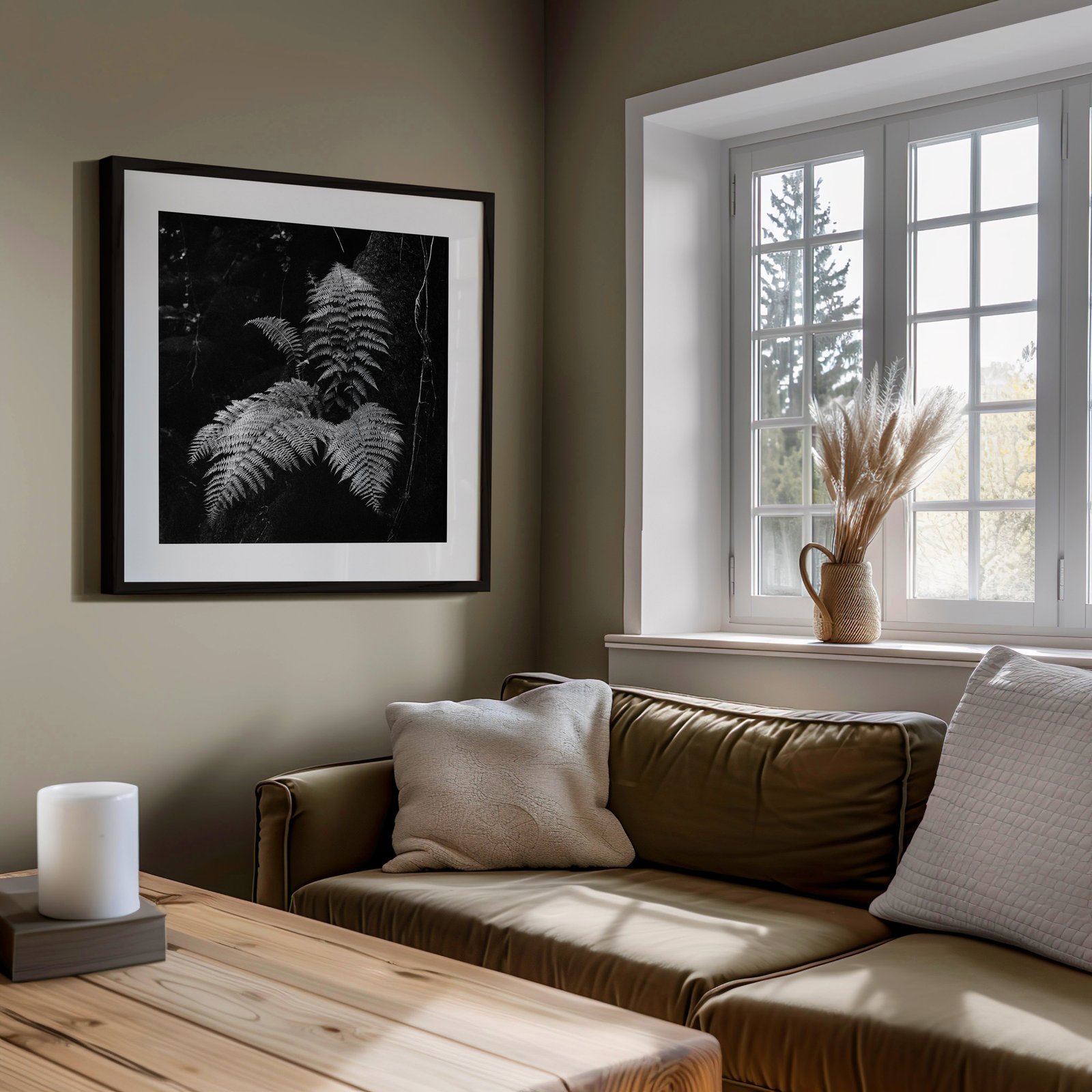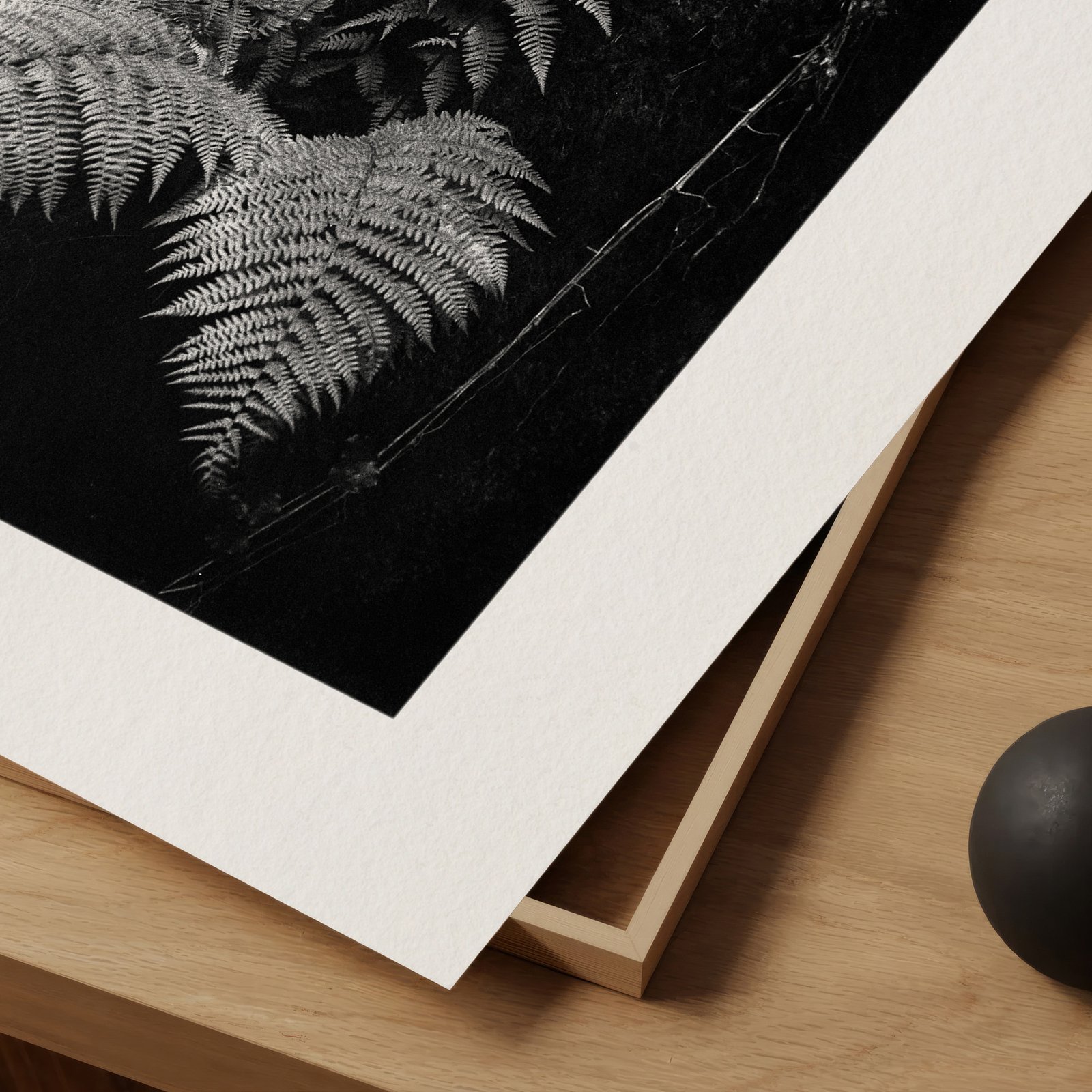 Delicate fern leaves stretch across a dark, moody background, with patterns etched in soft black and white. This print captures the quiet elegance of nature, where light and shadow play in harmony to reveal intricate details.