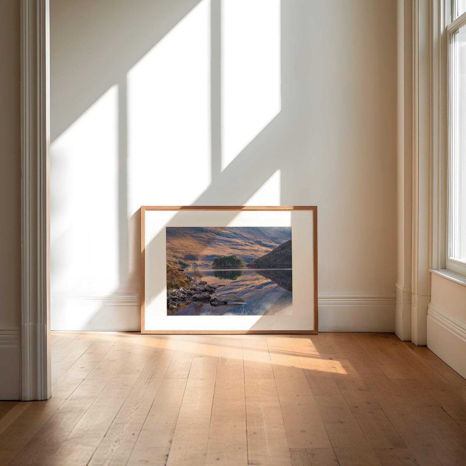 A small stand of pines gathers on an island in the loch, set against the vastness of Torridon’s mountains. Side light washes the scene in gold and blue, turning trees, water, and stone into something almost painted—balanced between landscape and quiet reverie.