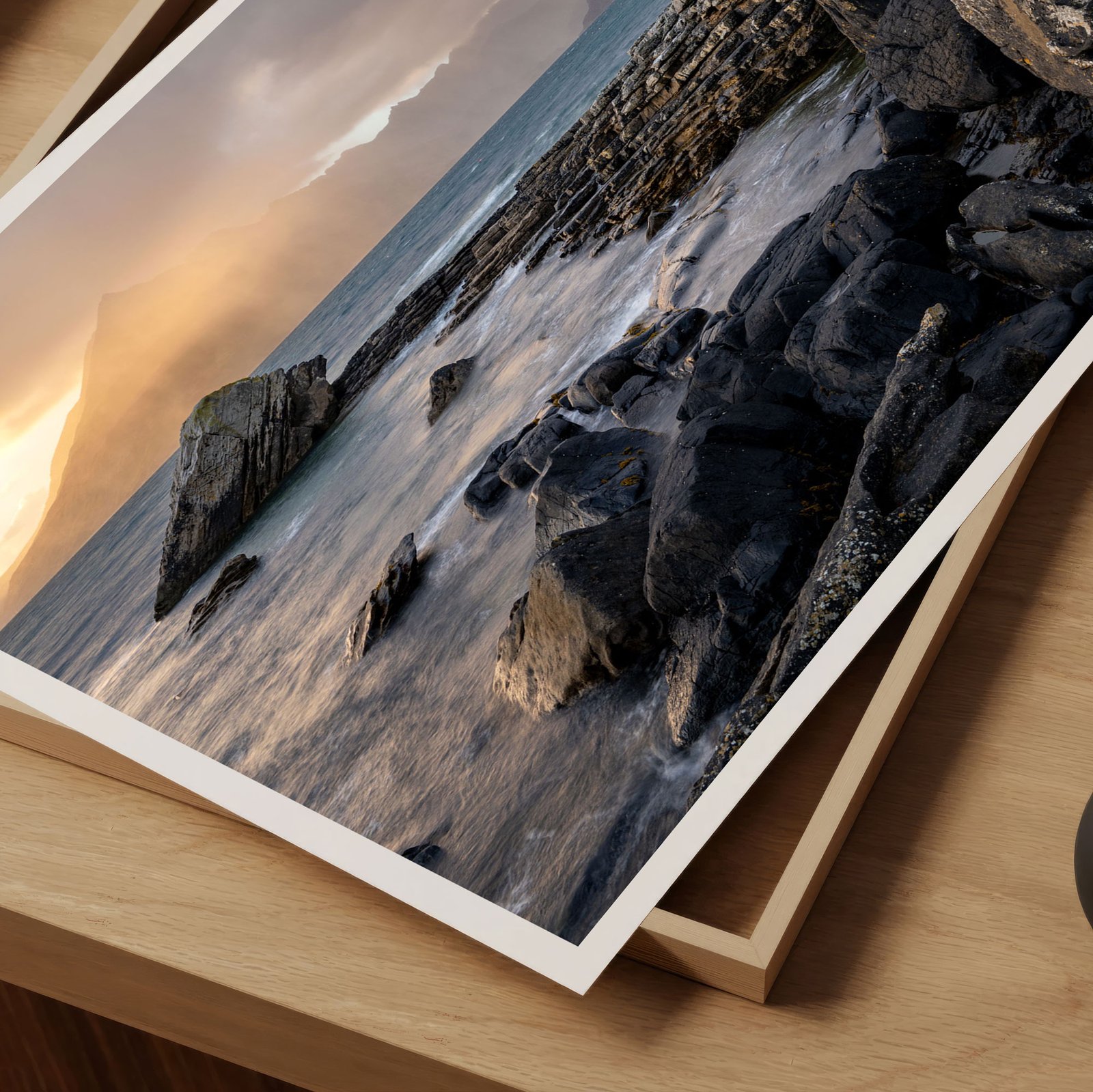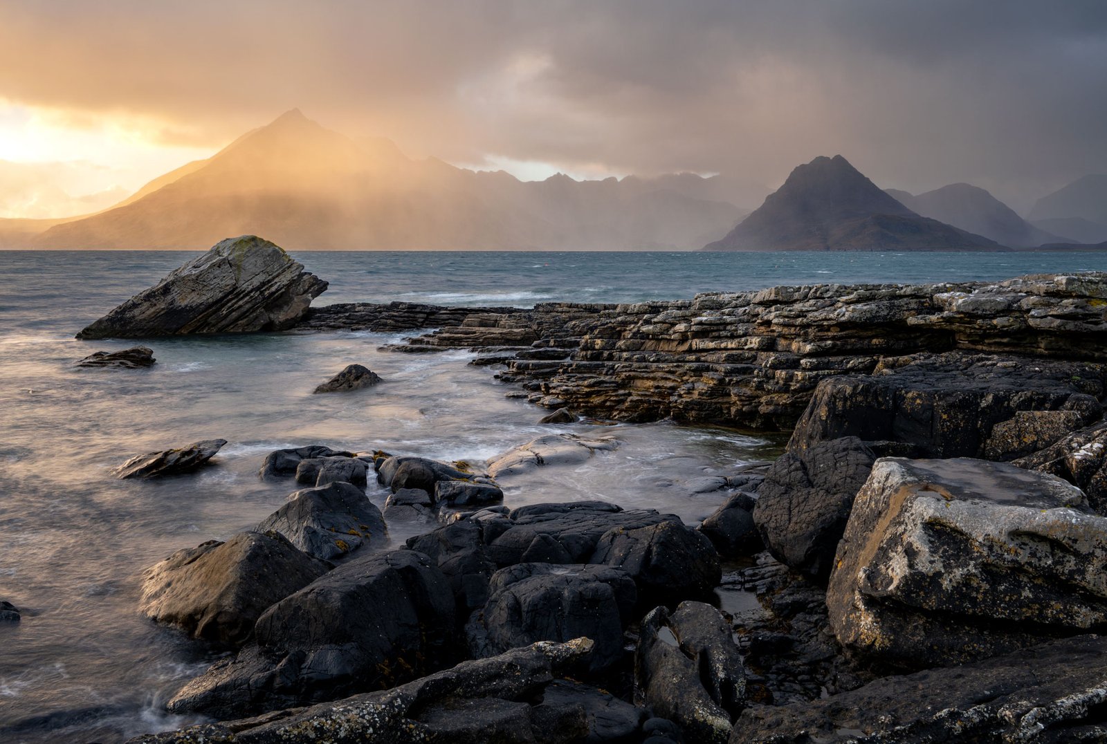 Golden light settles over Elgol as the sun slips toward the horizon, the mountains holding the last glow of day. Sea and stone soften into shadow, leaving a moment that feels expansive, calm, and quietly luminous.