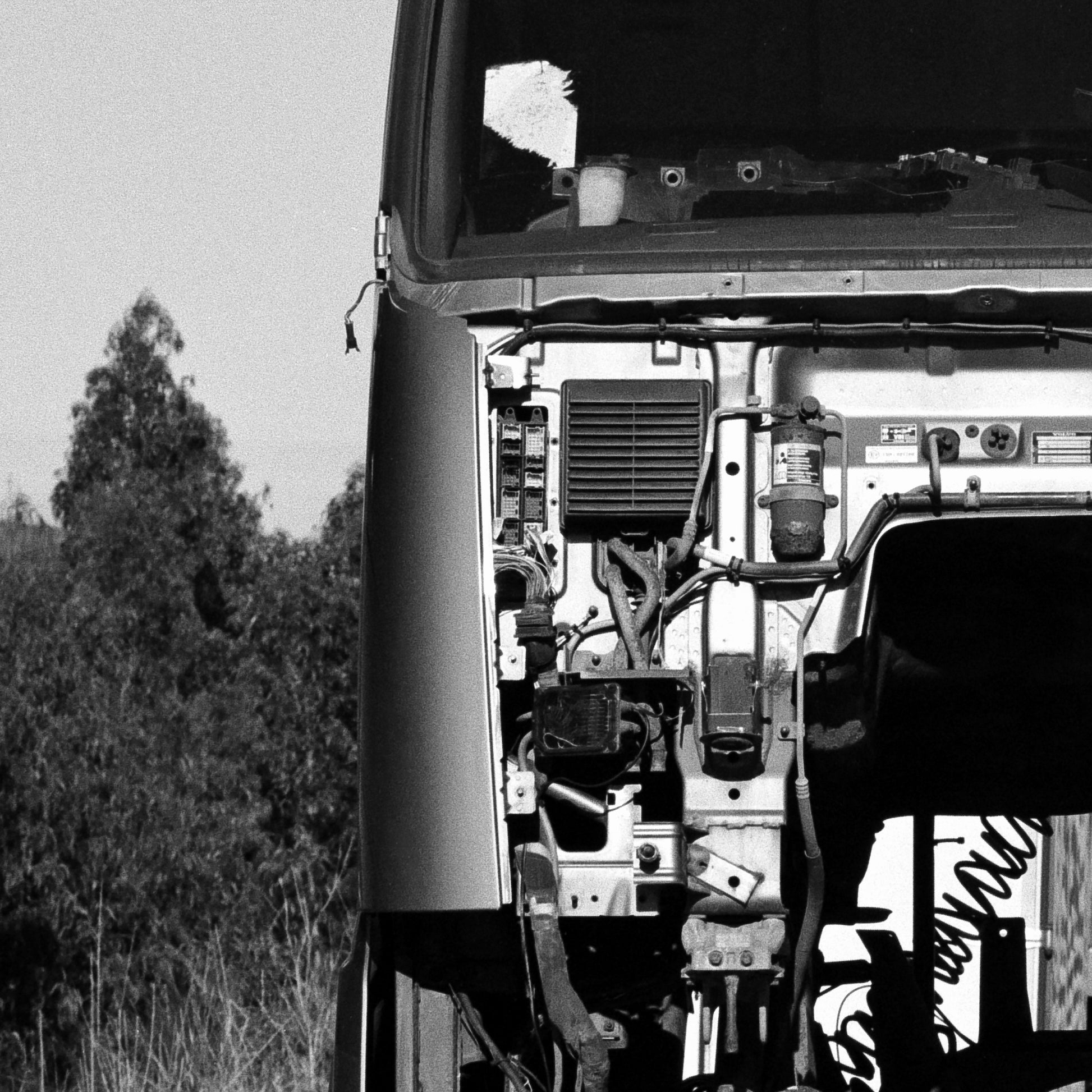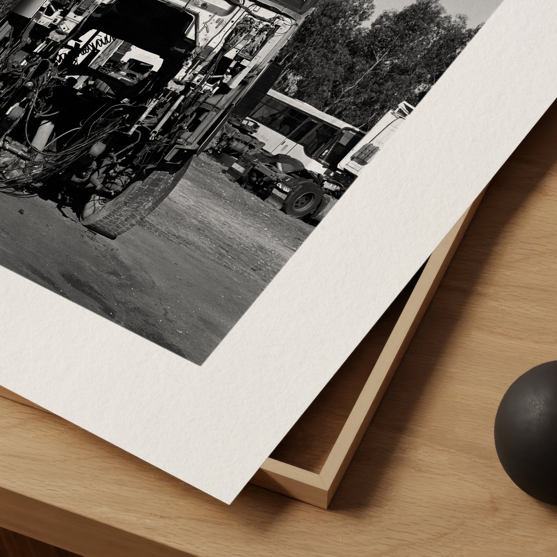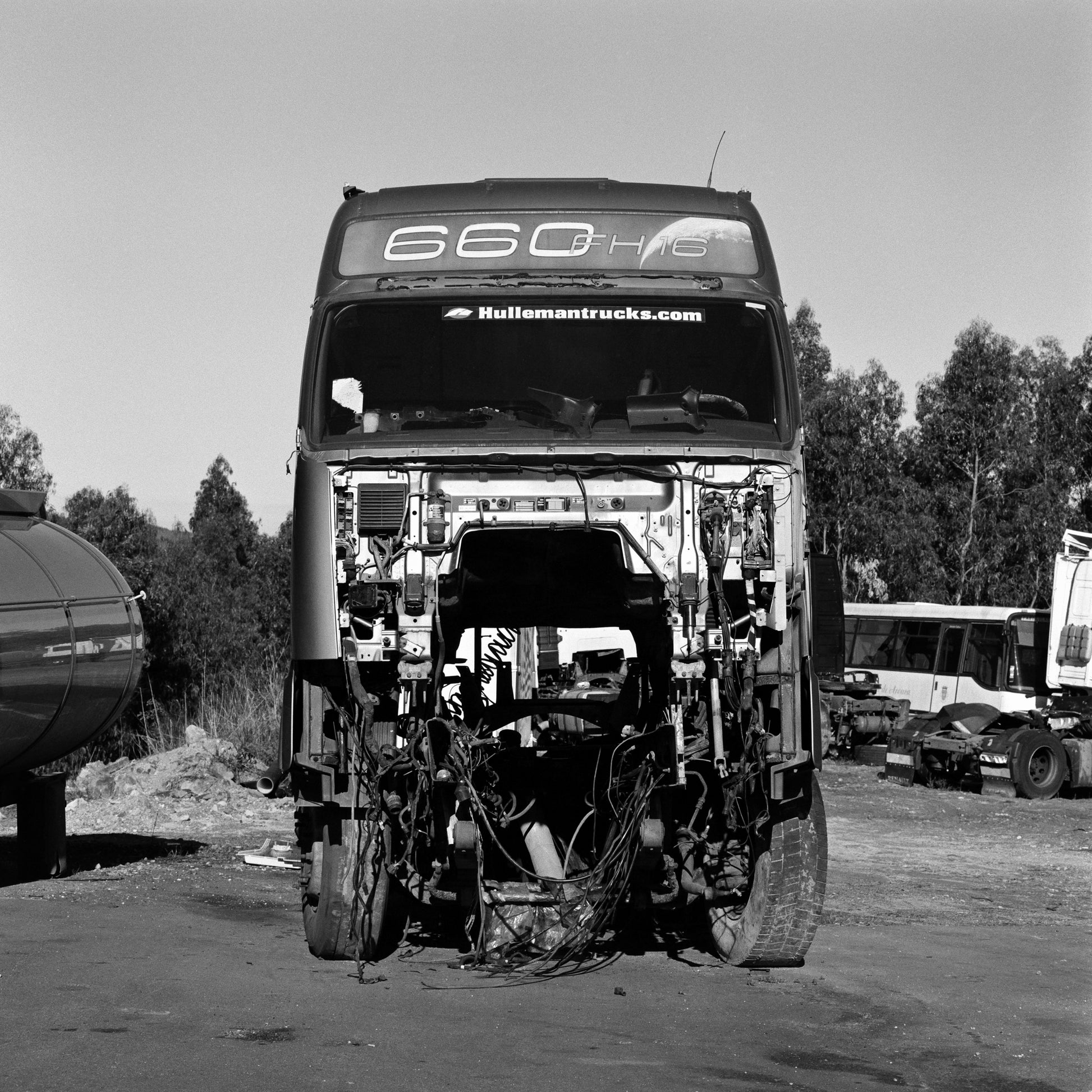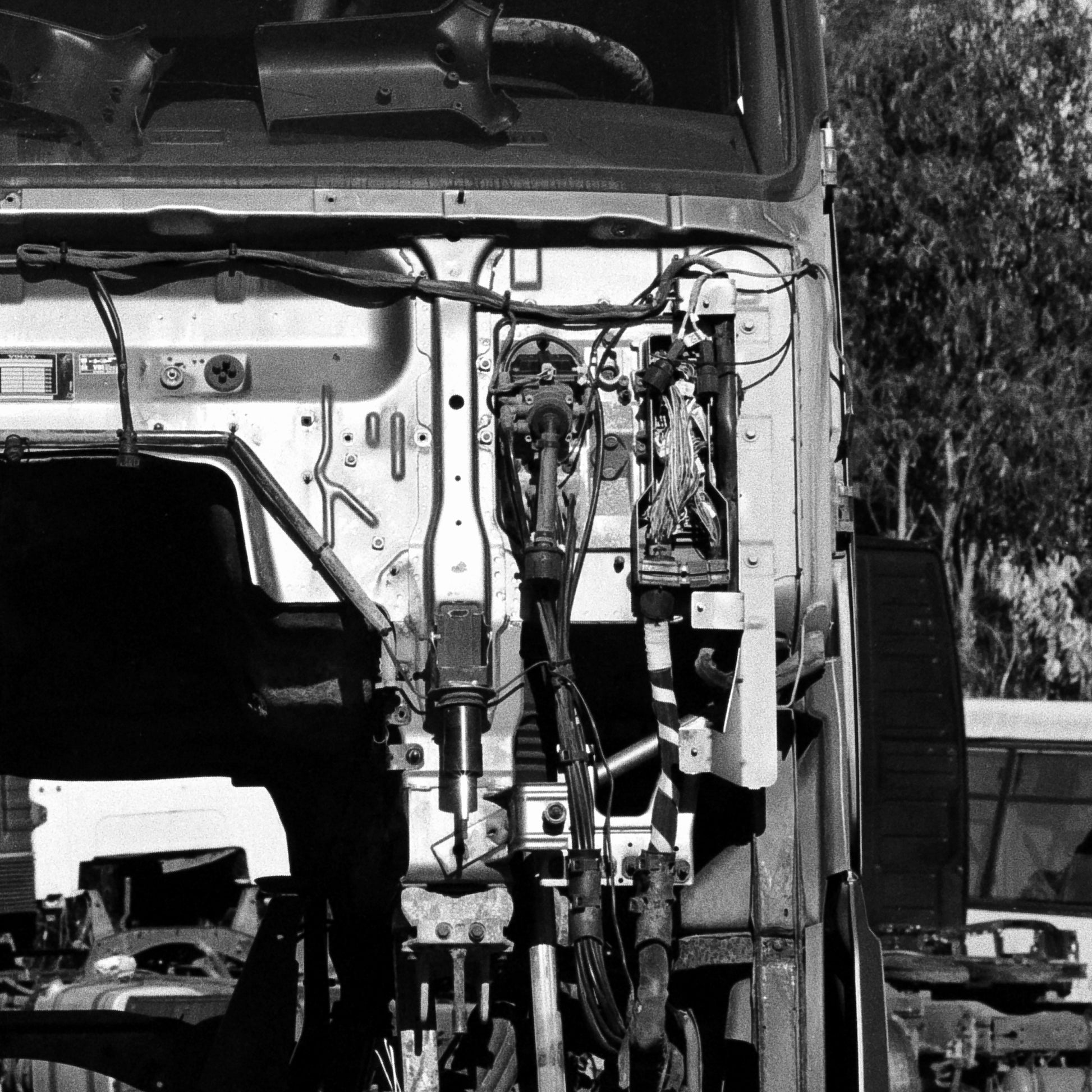 This striking black-and-white image lays bare the heart of a truck, exposing its intricate inner workings. Stripped of its outer shell, it reveals the anatomy of a machine and tells a story of utility, wear, and the passage of time.