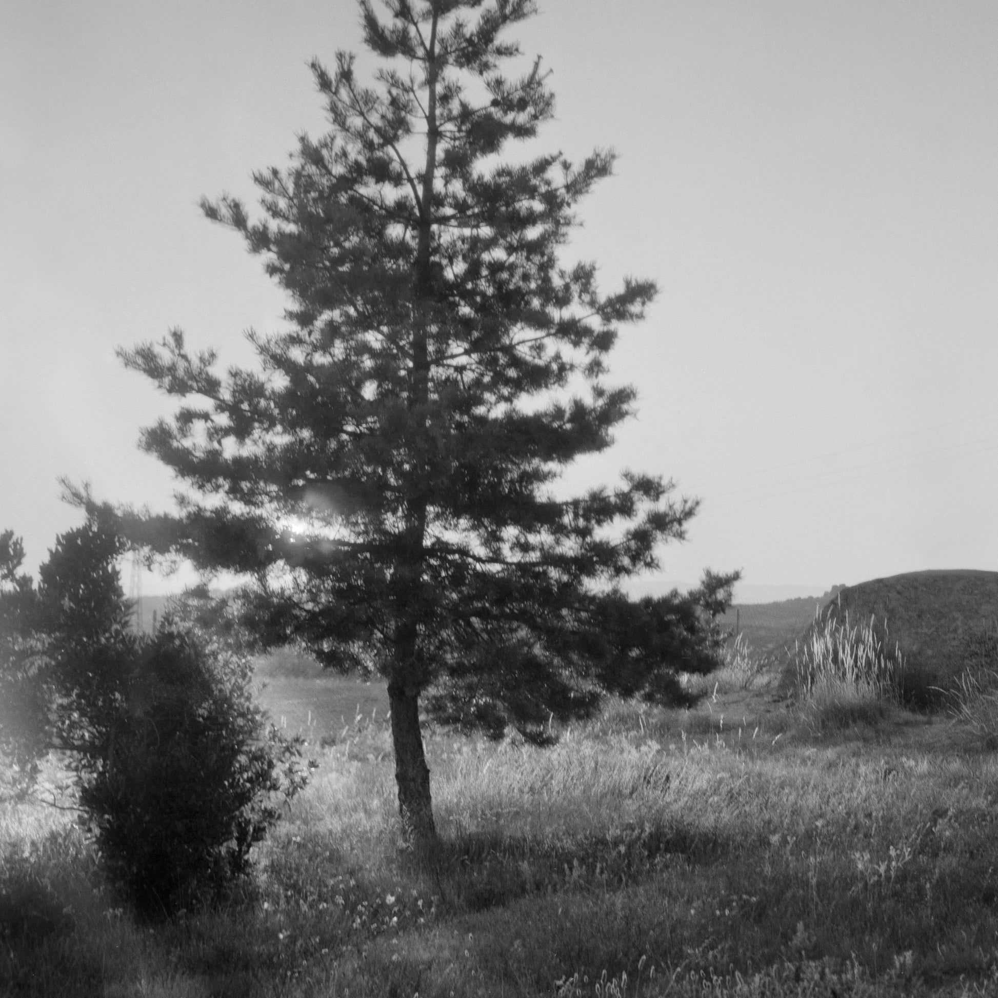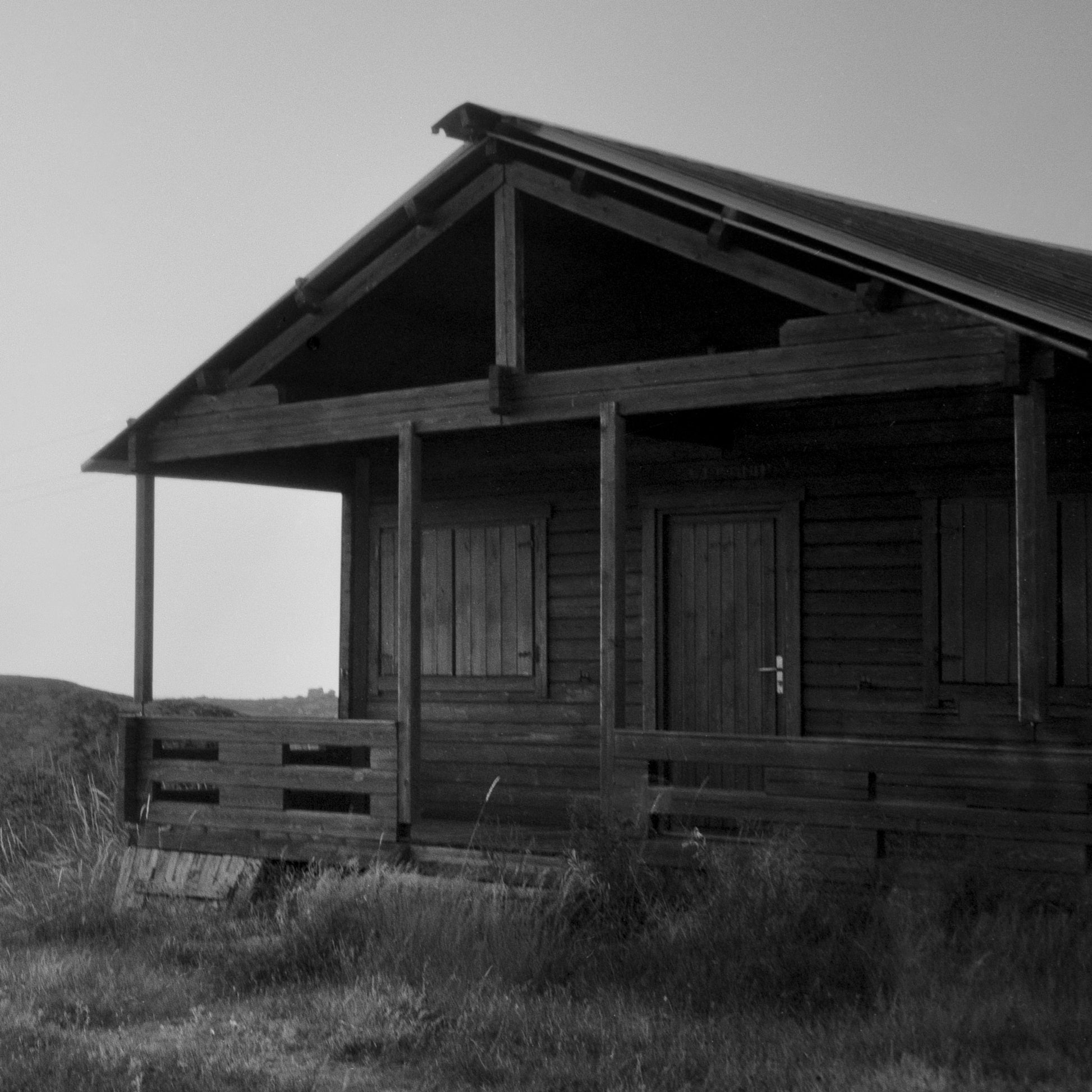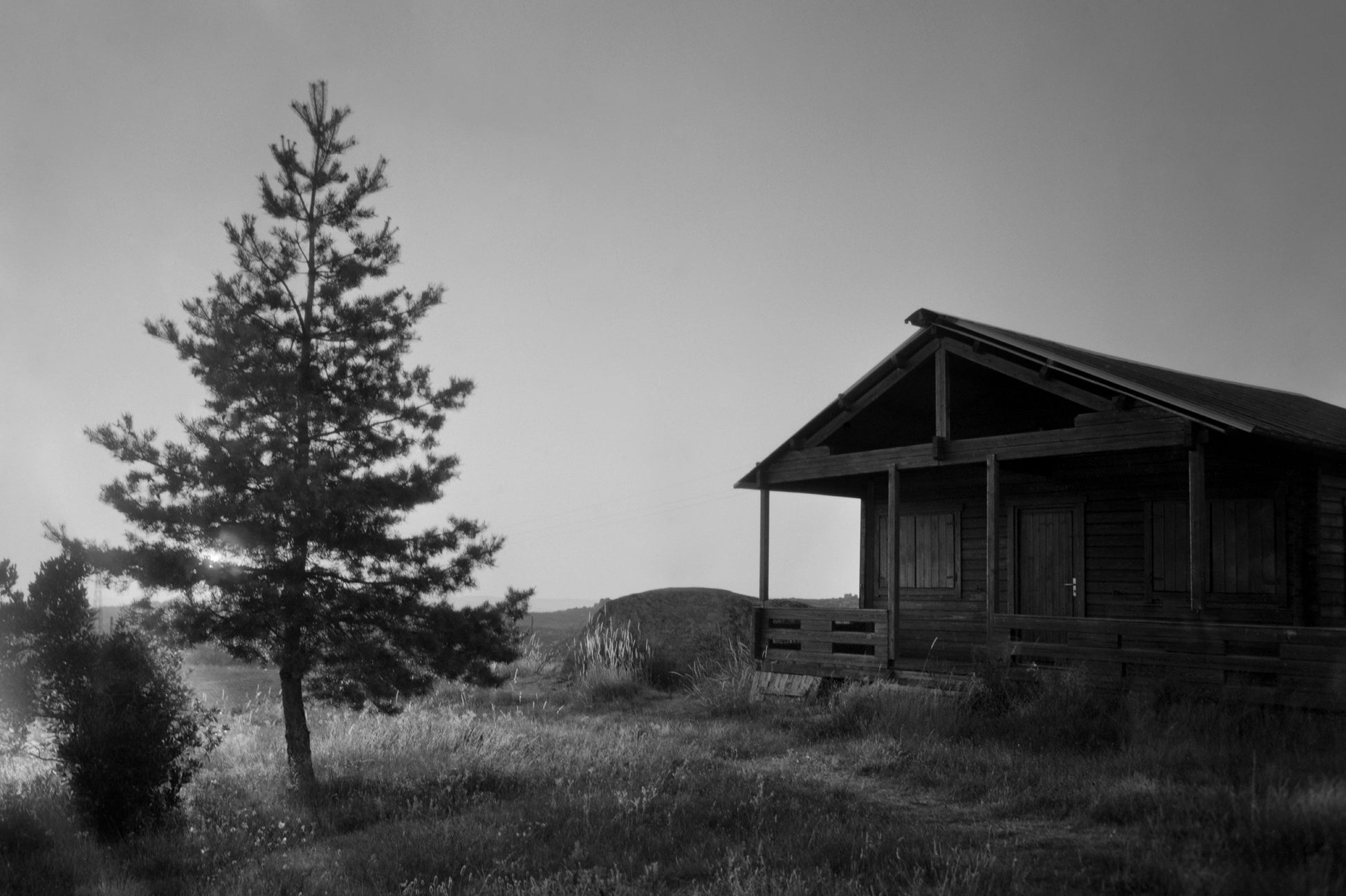 A wooden cabin stands beneath a solitary tree, bathed in the soft glow of a black-and-white sunset. In the stillness, the scene whispers of refuge, home, and the quiet calm that comes with finding peace in simplicity.