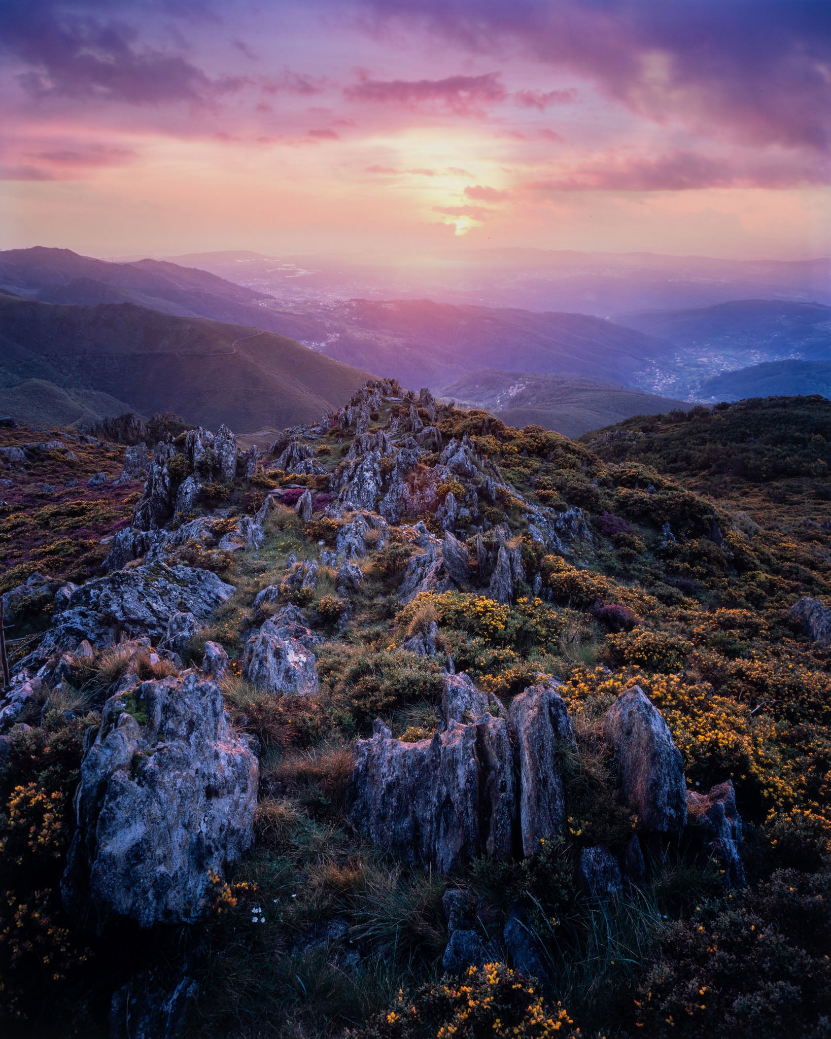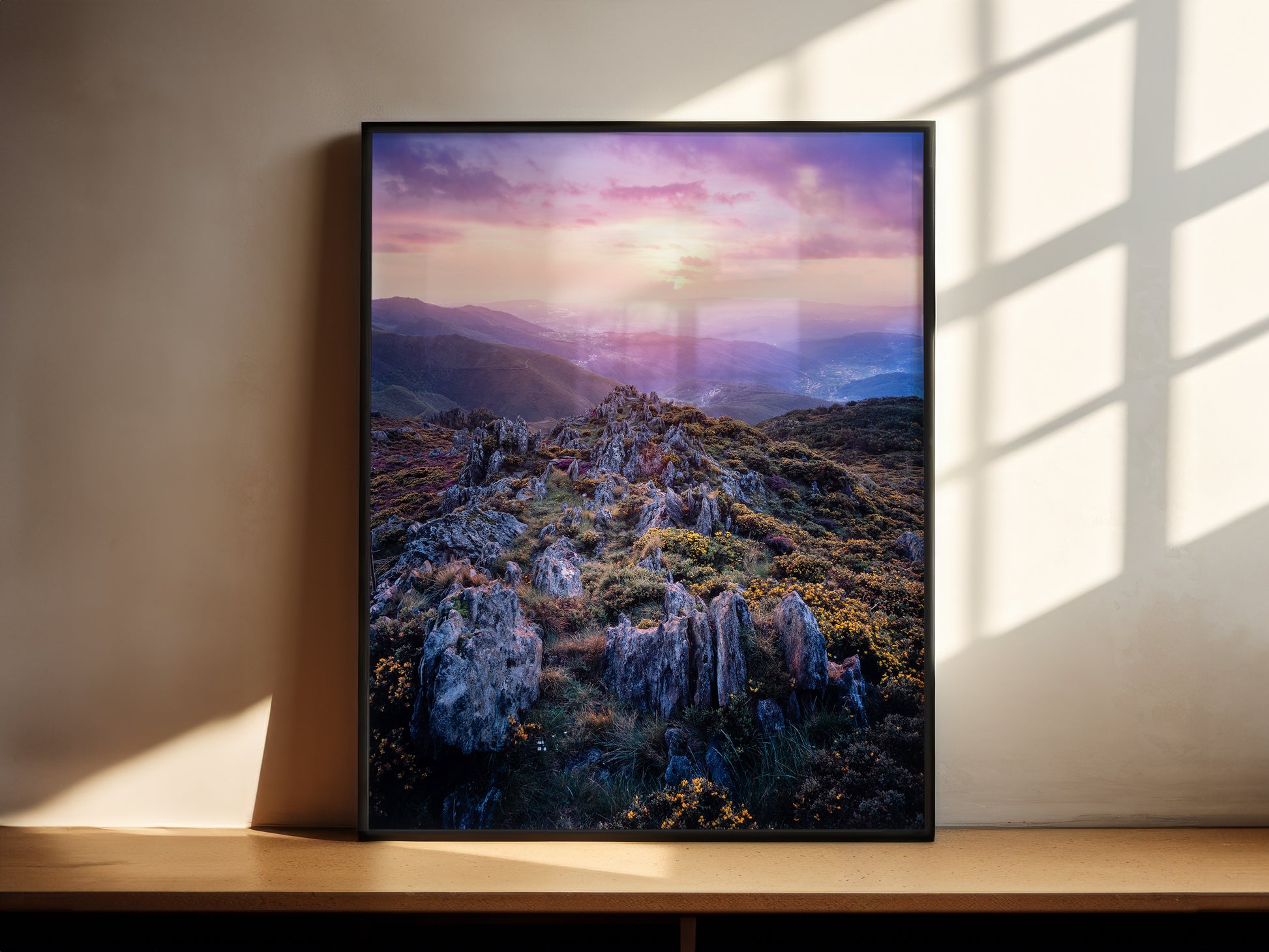 As the sun dips below the hills, the landscape blooms with color - amber skies, violet shadows, and golden blossoms tucked among ancient stone.
