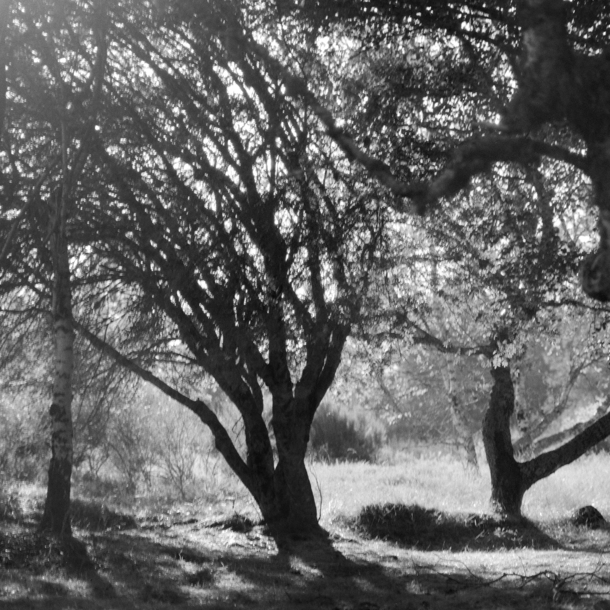 The forest comes alive with beams of fading light piercing through the trees. The black-and-white tones enhance the magical depth of the scene, where light and darkness dance in an enchanted, mysterious embrace.