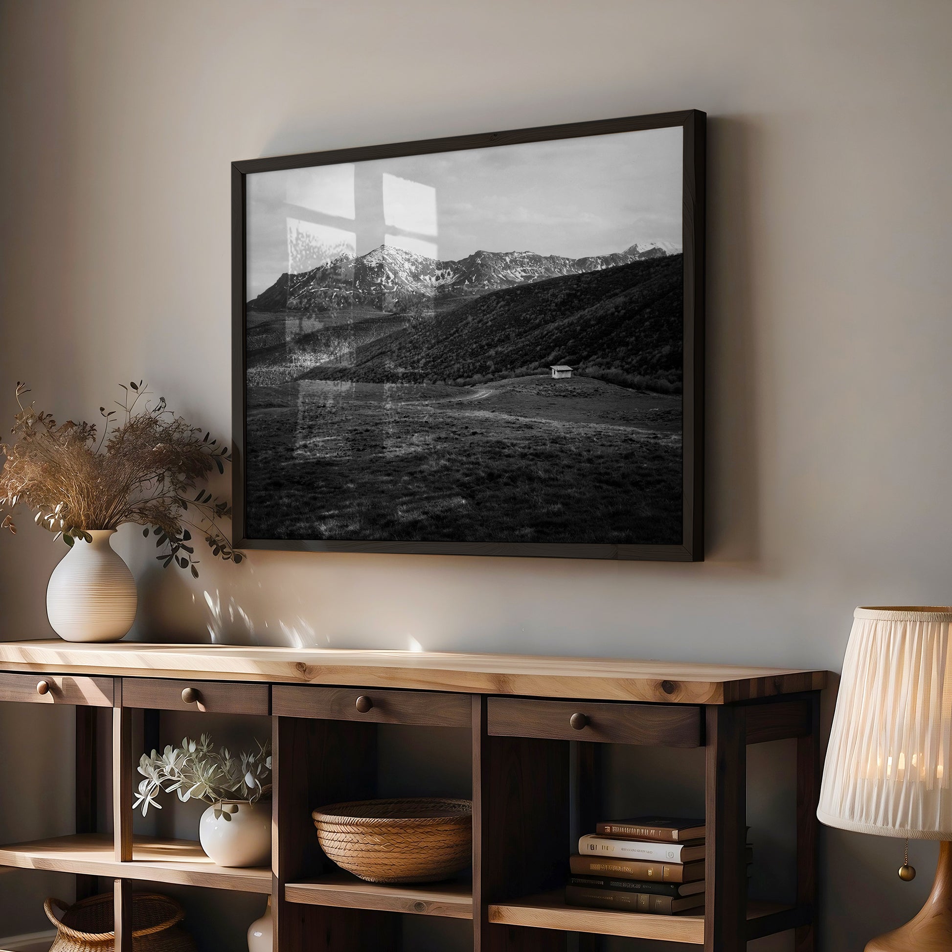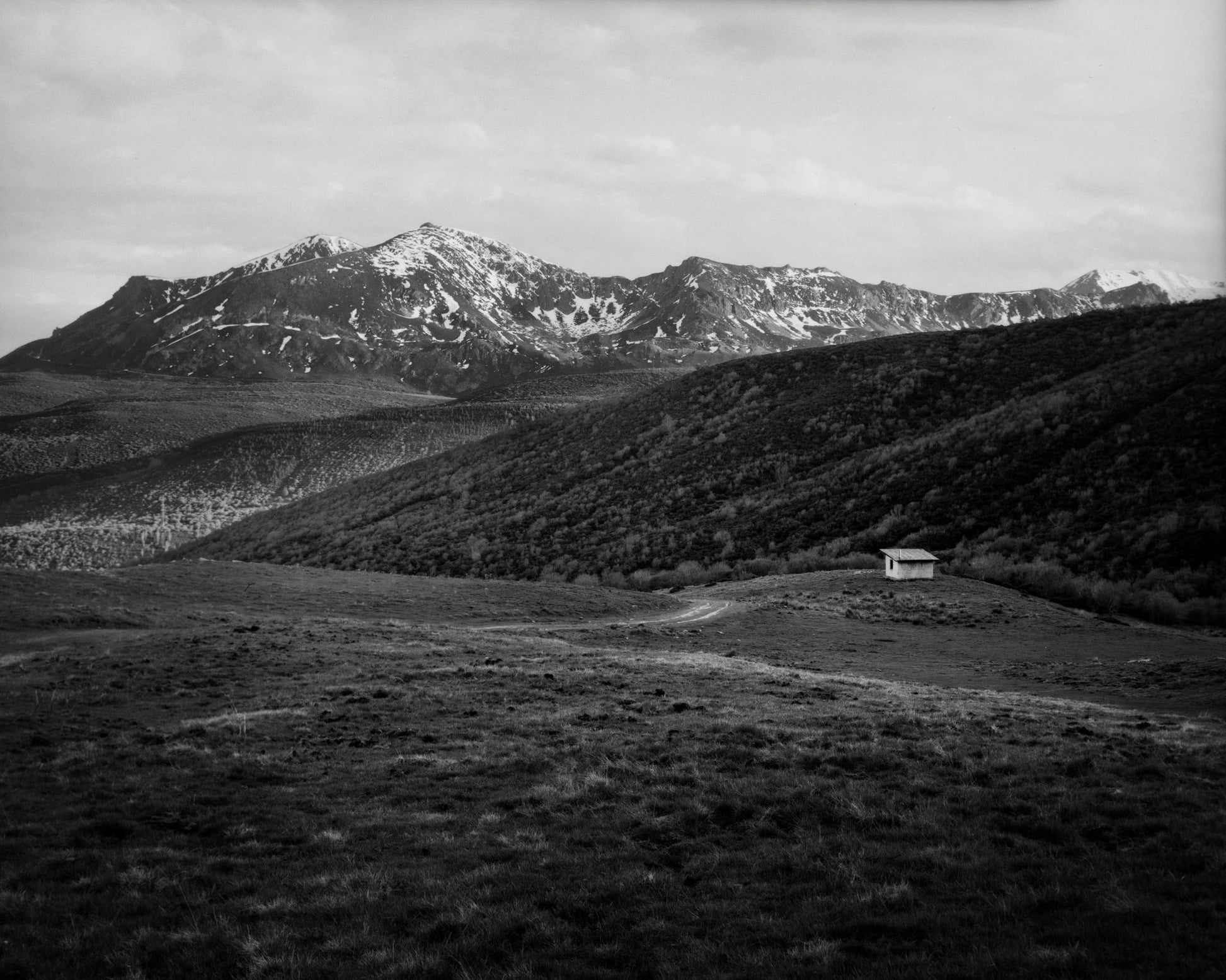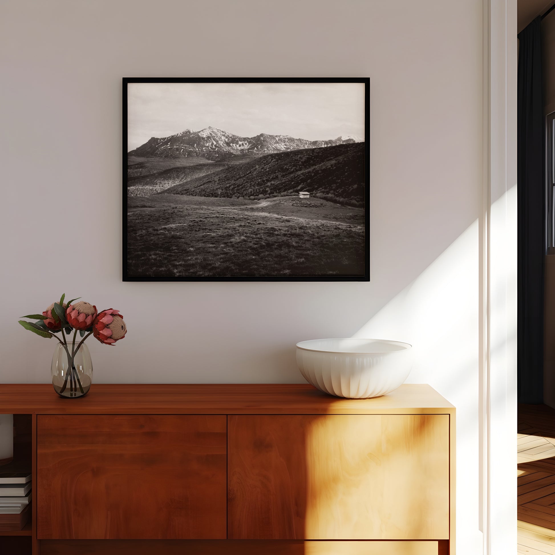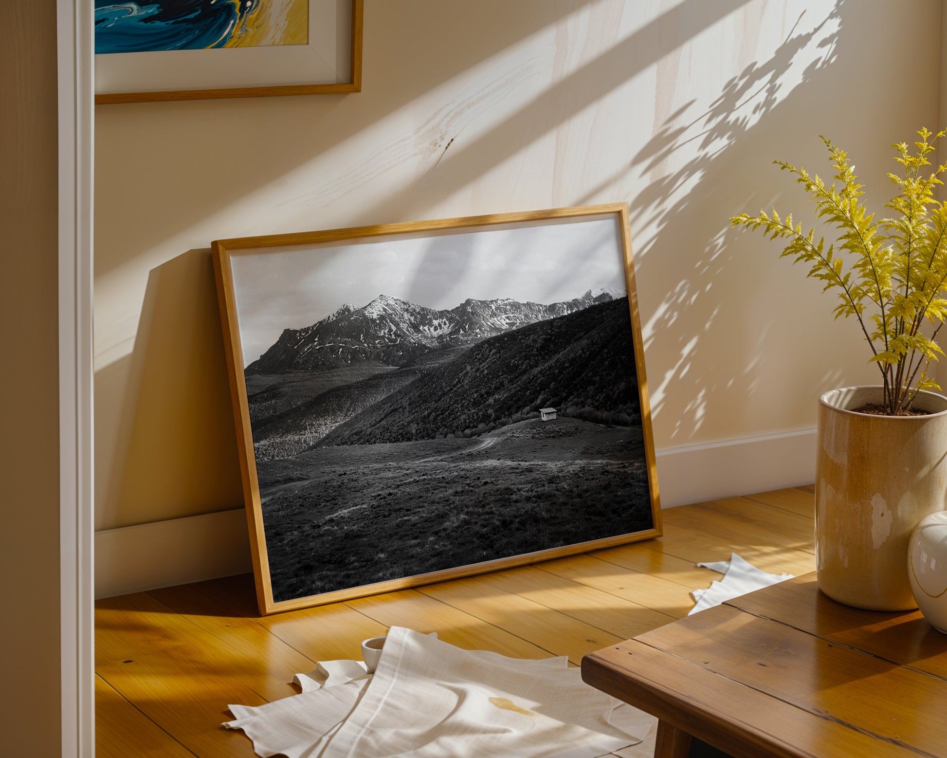 A solitary structure rests at the edge of a sweeping valley, facing a rugged mountain range dusted with snow. The land is raw and quiet, the tones muted, rich in contrast and texture. This is a place shaped by wind, time, and silence. A human mark, small but persistent, against the vastness of nature’s design.