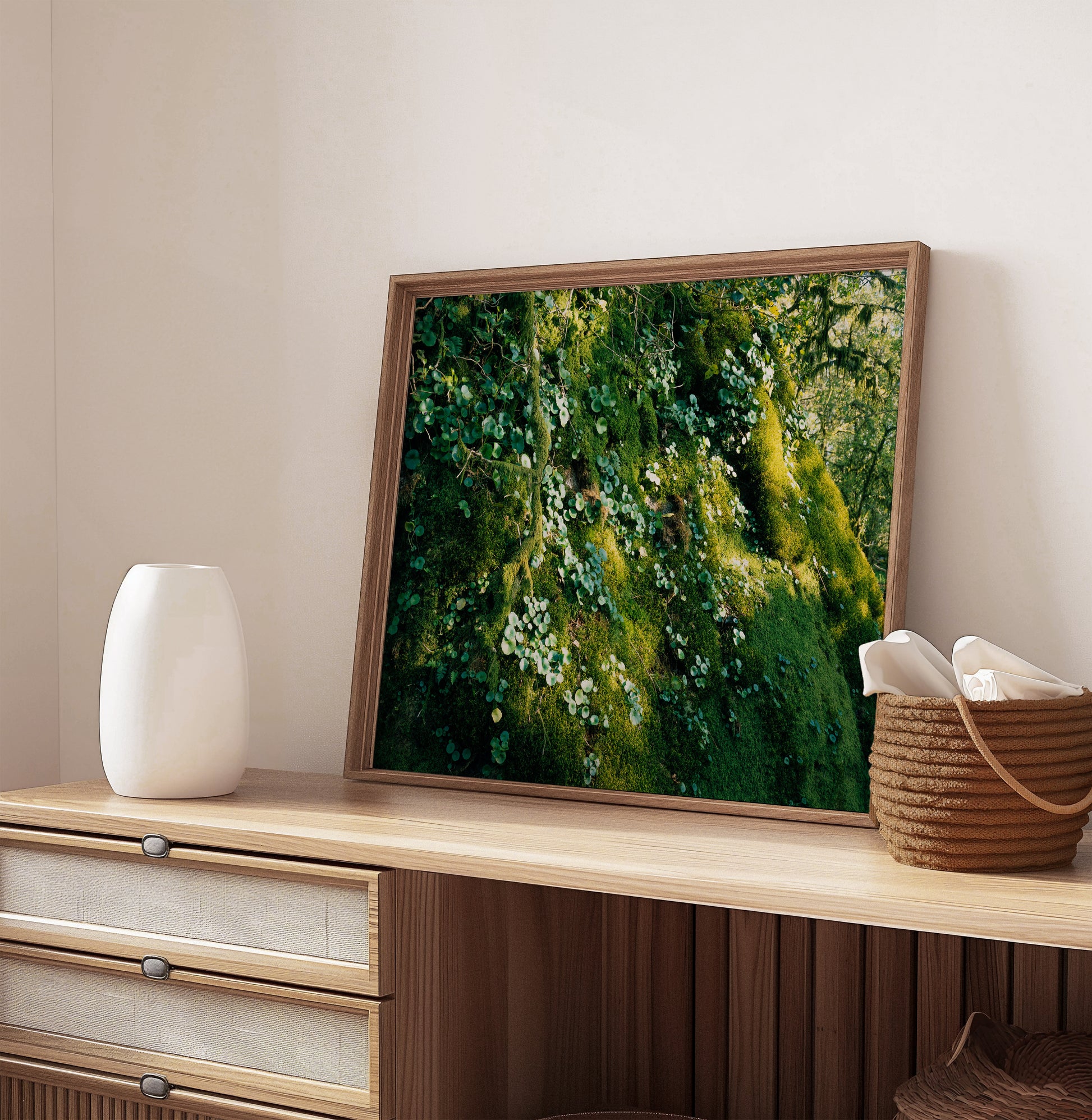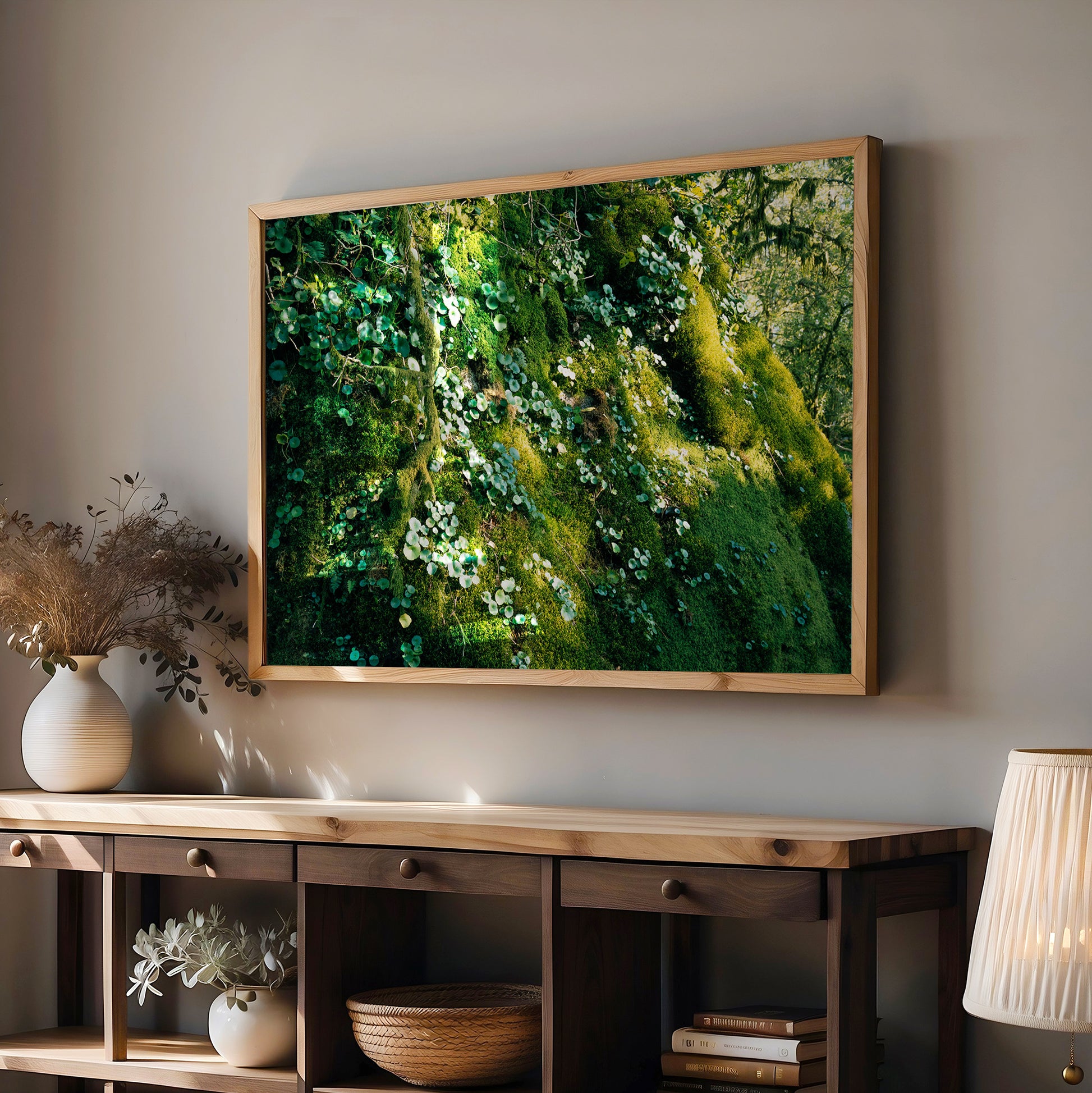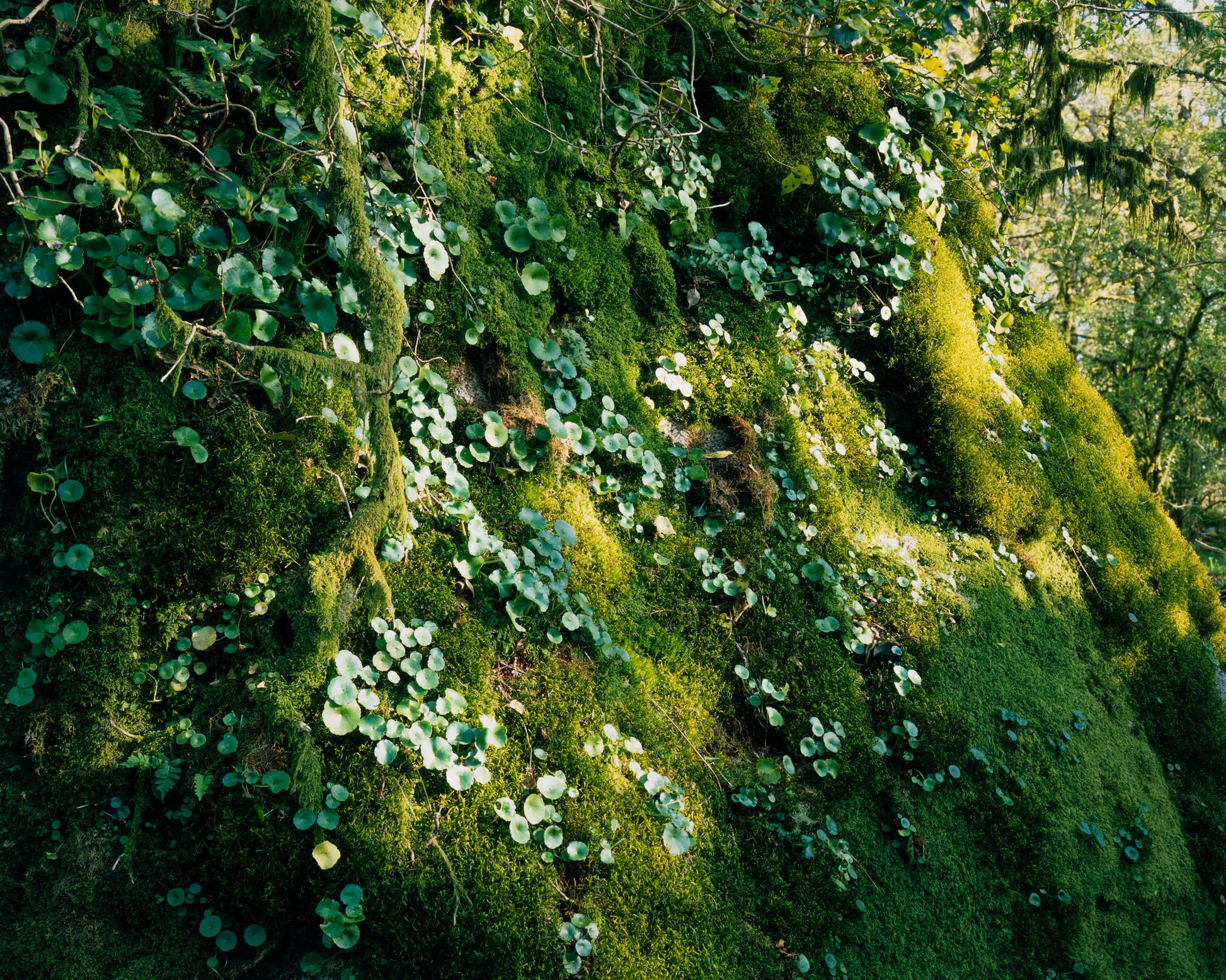 Sunlight filters through the canopy, casting shifting patches of gold across a moss-covered hillside. Tiny round leaves pepper the slope like nature’s own embroidery, while vines and branches wind gently across the scene. It's an intimate, living landscape.