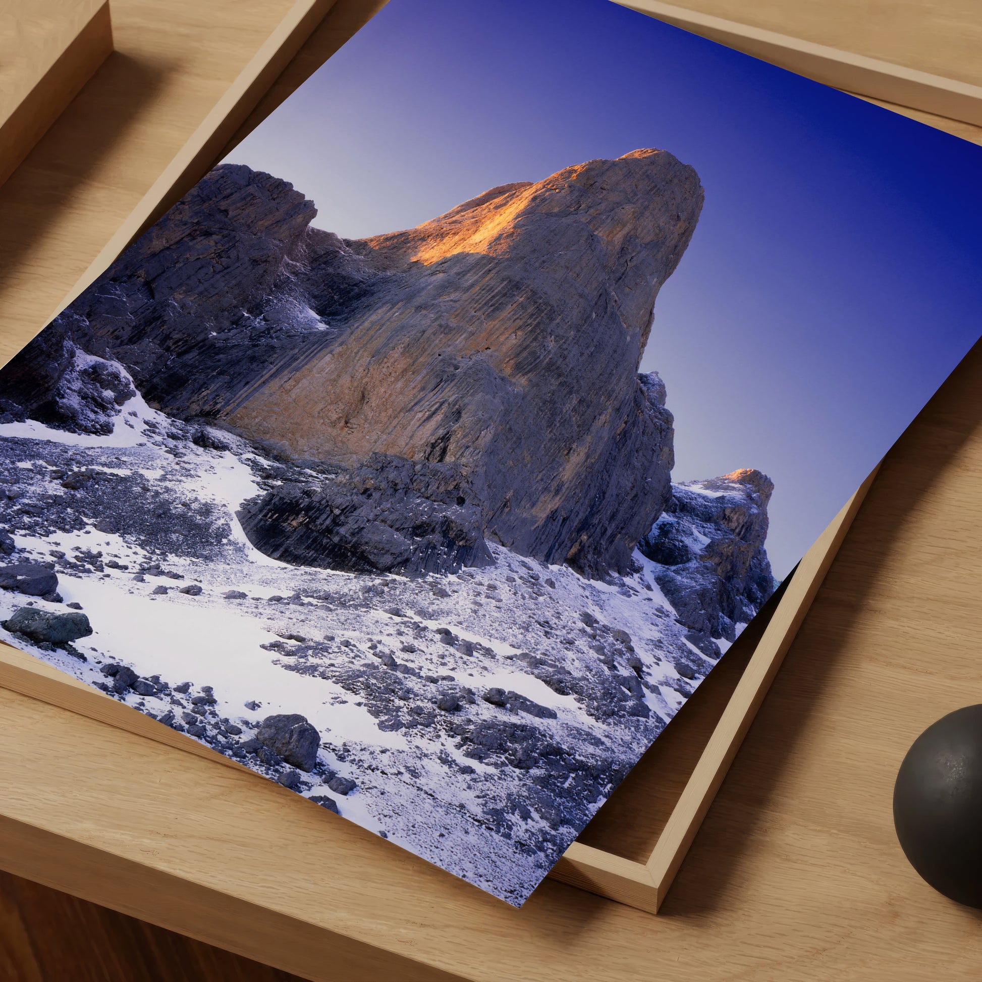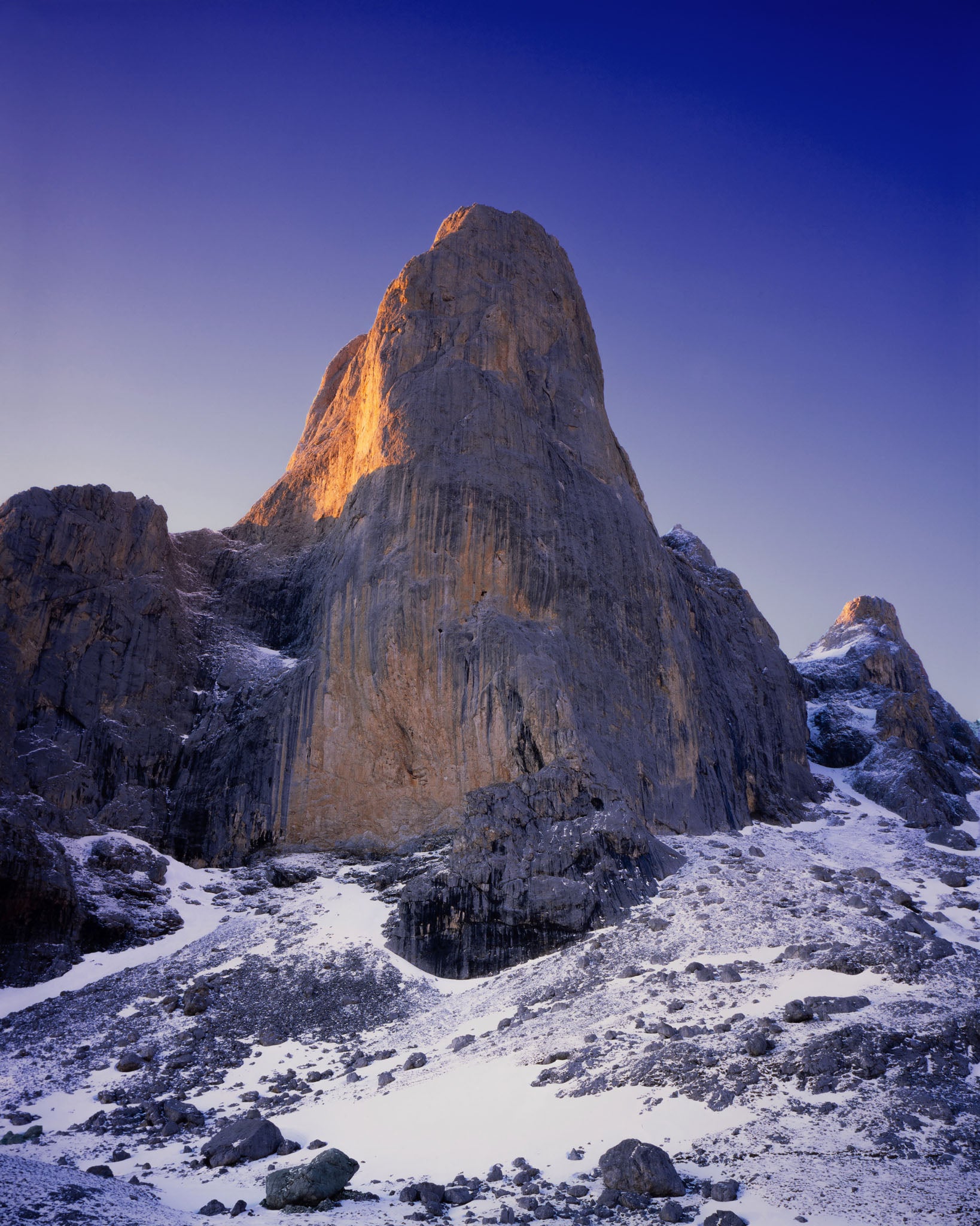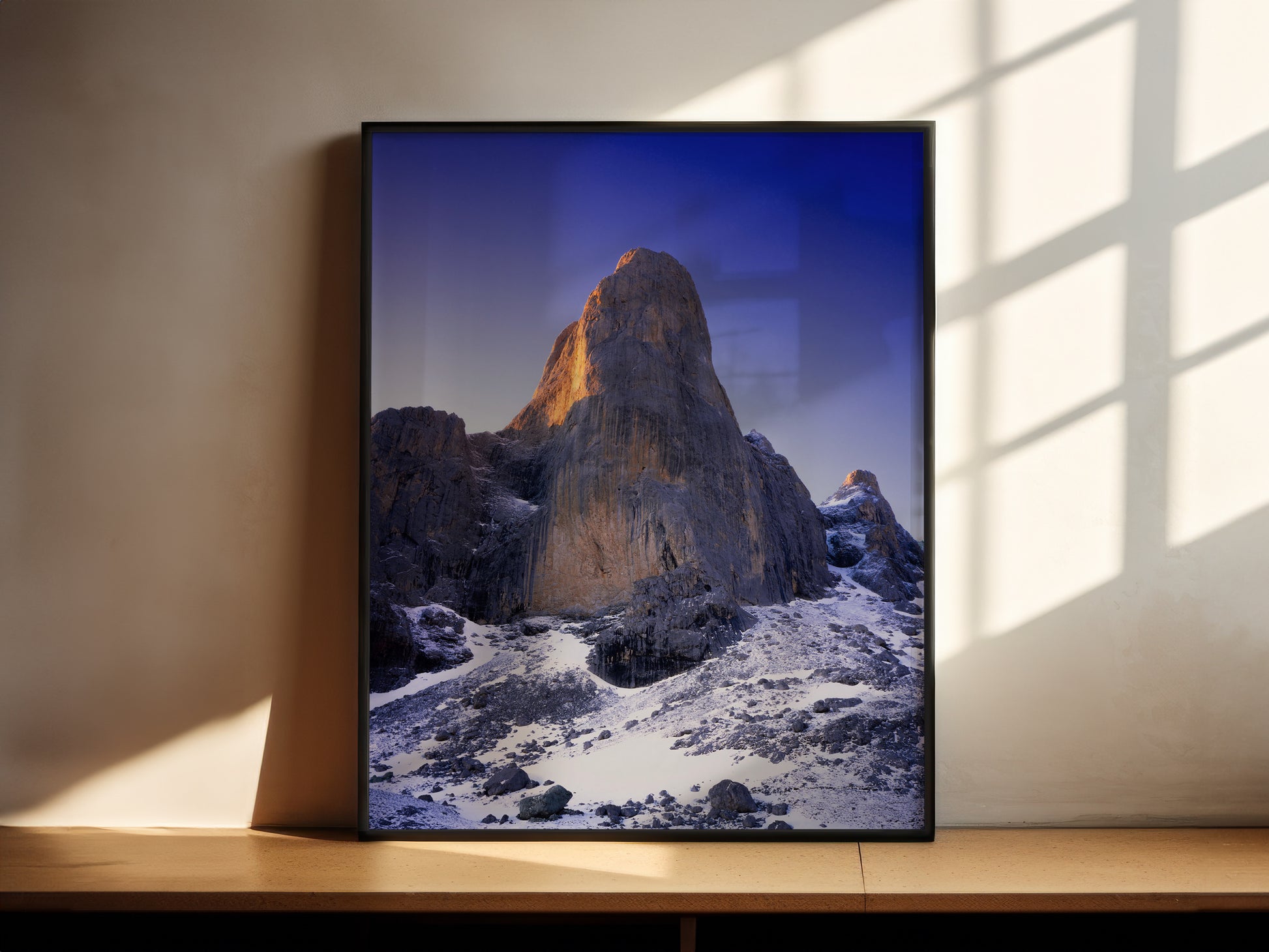 The morning sun brushes Naranjo de Bulnes with gold, awakening the mountain from its slumber. Warm light spills over cold stone, an embrace between fire and ice. This moment captures the still power of the immovable peak, touched by the gentlest light that marks the beginning of the day with reverence.