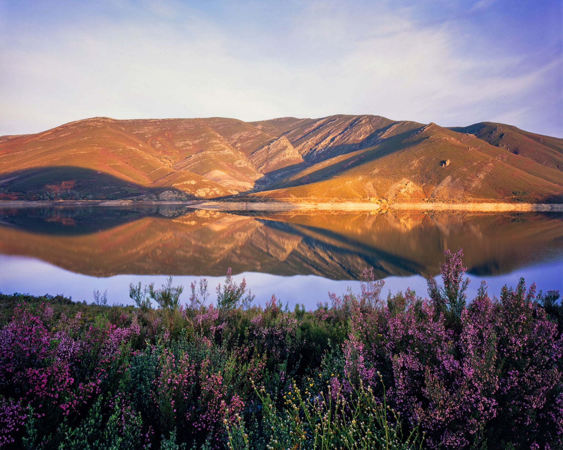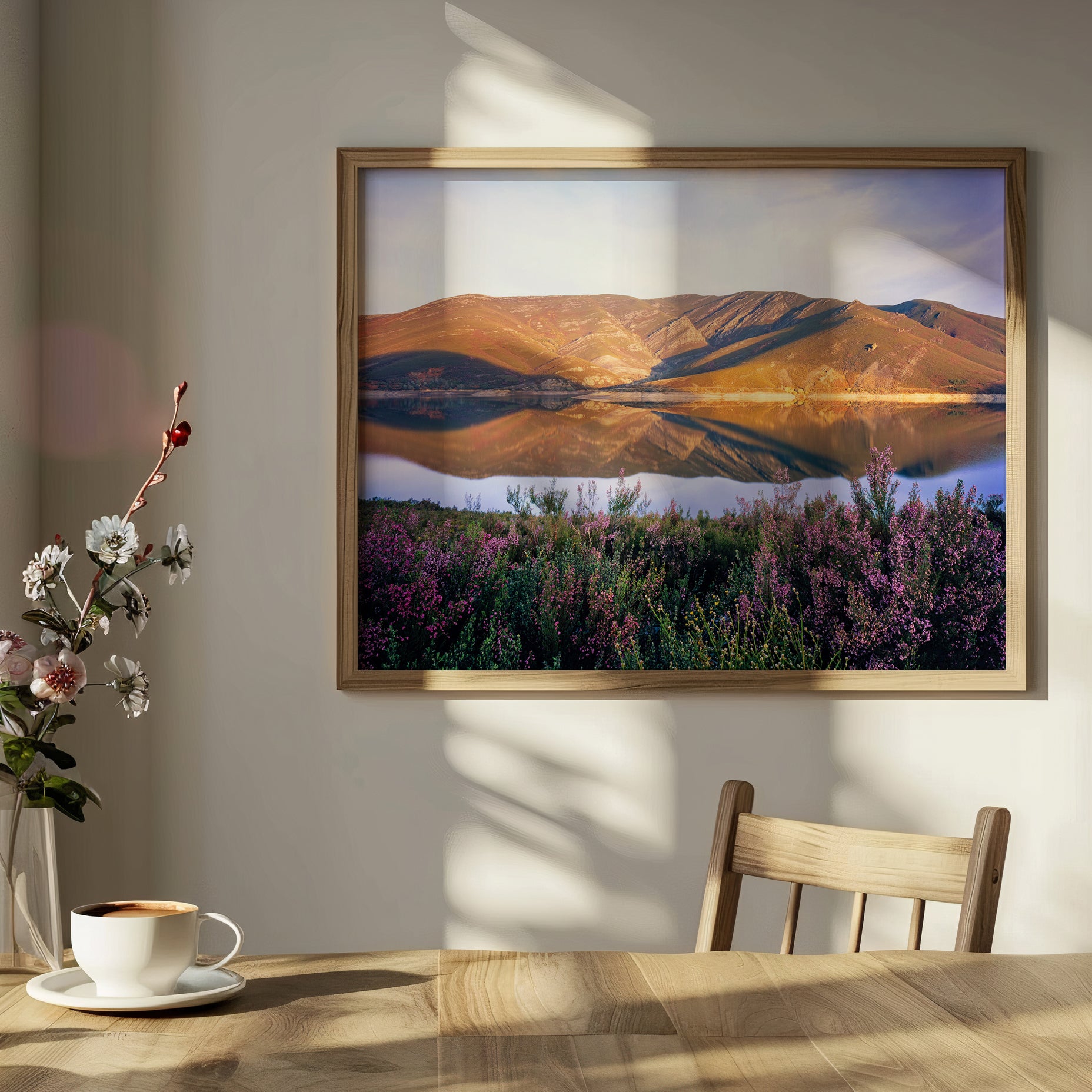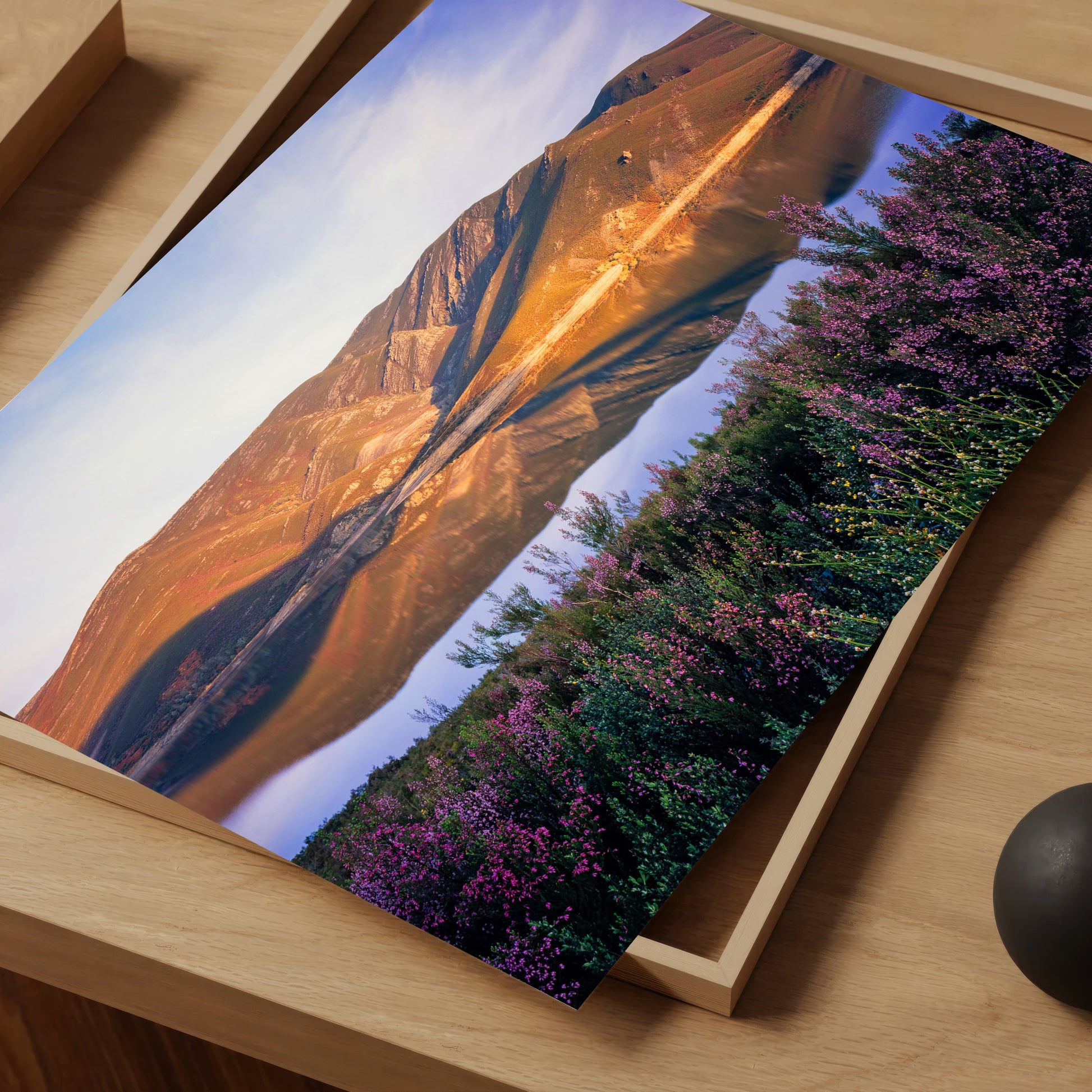 A perfect reflection turns the mountain into a symmetrical sculpture of light and shadow, doubled by the placid lake. Heather and wildflowers bloom along the shore, while the sweeping hills stretch calmly across the horizon.