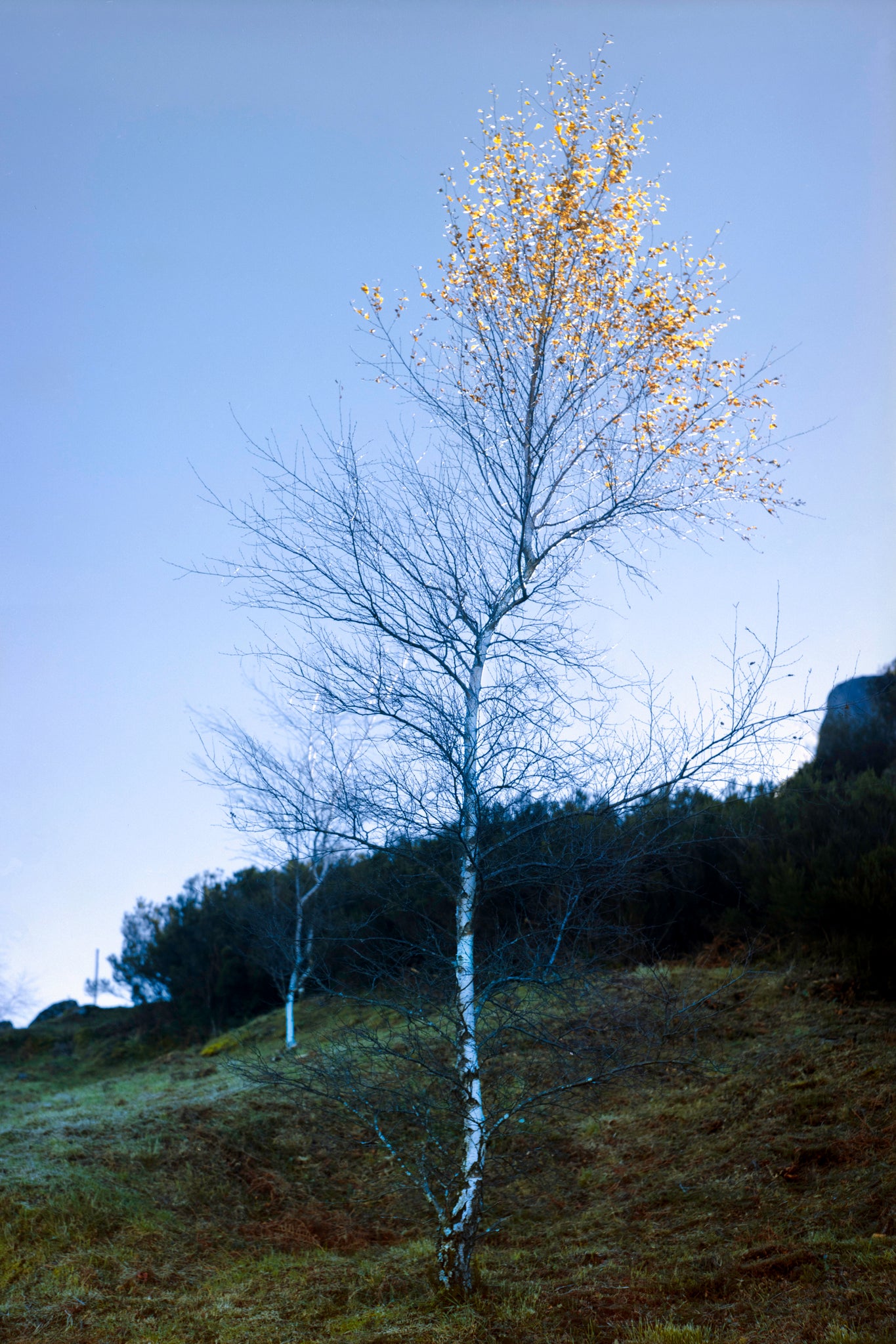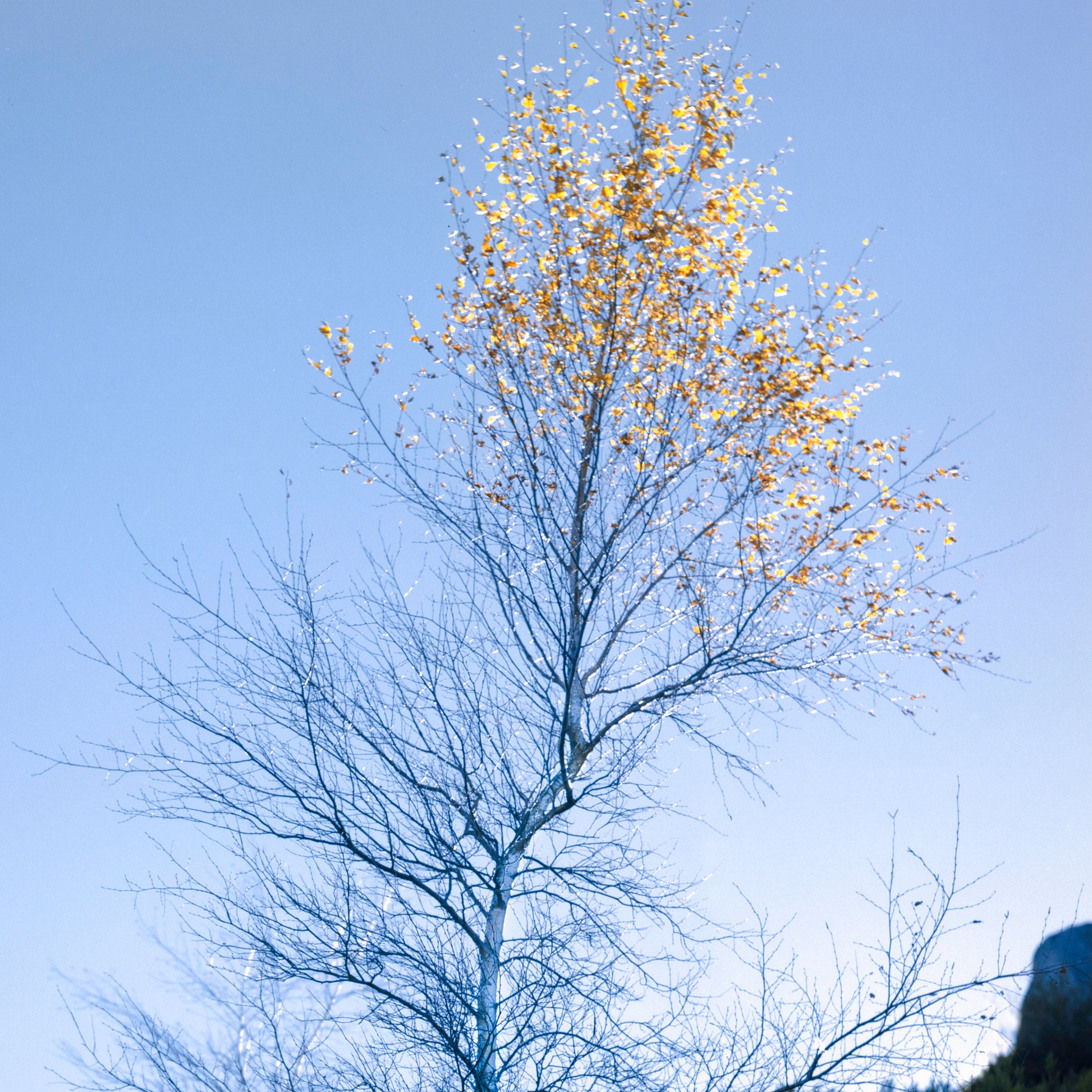 A bare tree stands against the fading season, its few golden leaves clinging to the branches. In this quiet moment, the last remnants of autumn linger, holding onto their brilliance as the world prepares for winter’s embrace.