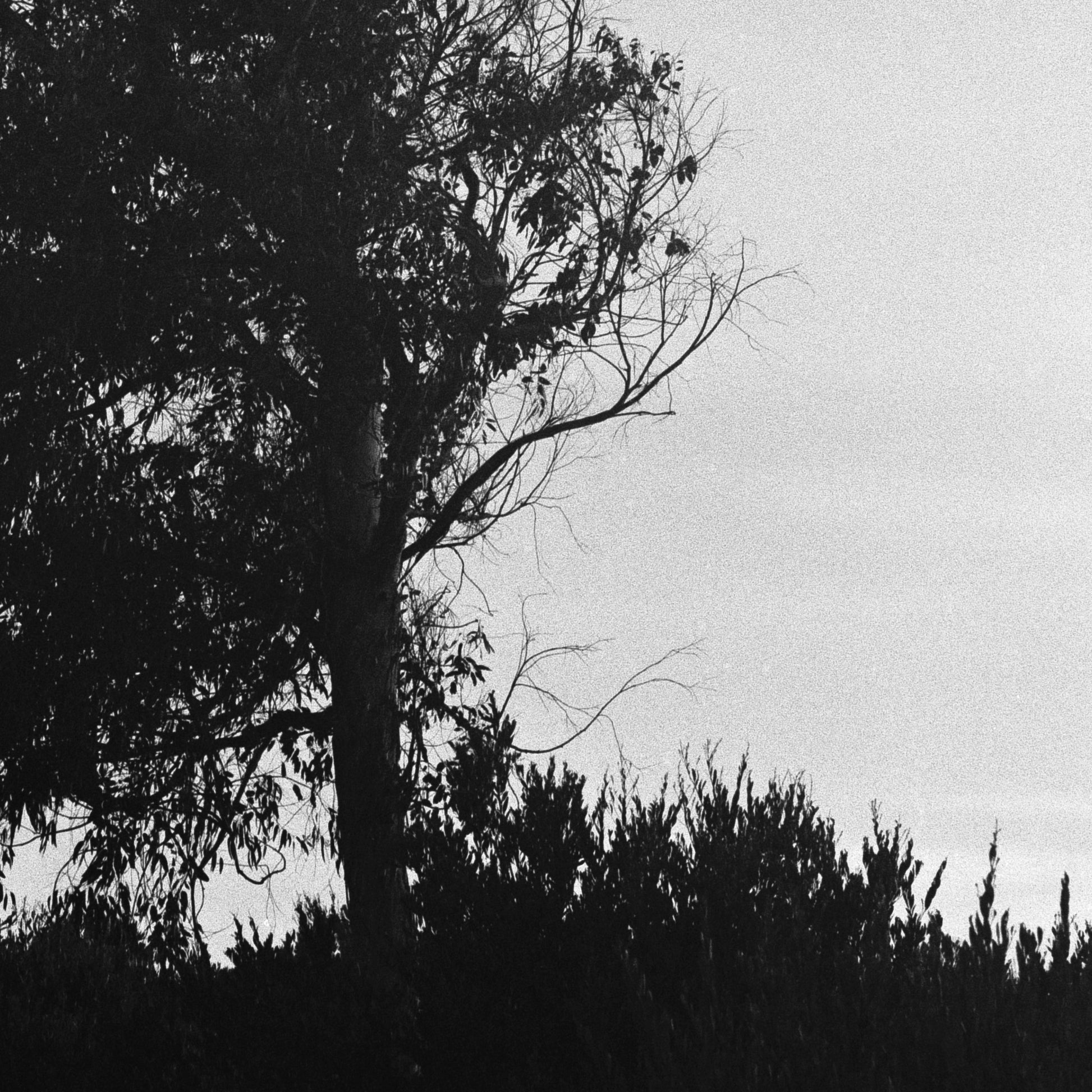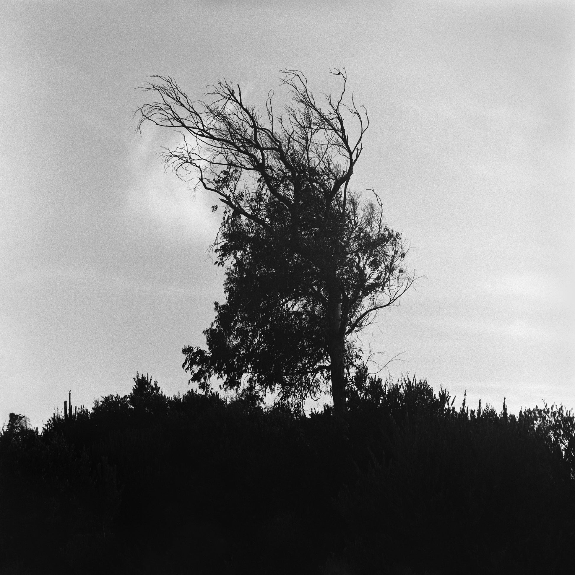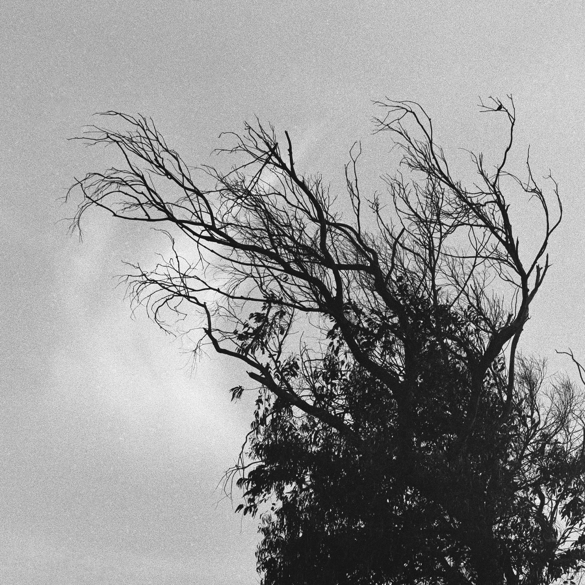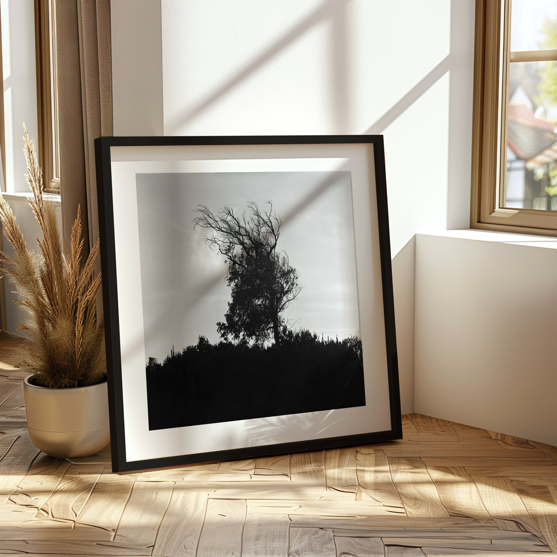 An eerie tree stands alone, its twisted branches reaching into the moody black-and-white void. In the stillness, it seems to murmur secrets carried by the wind—whispers of time, solitude, and the unseen mysteries that linger in the shadows.