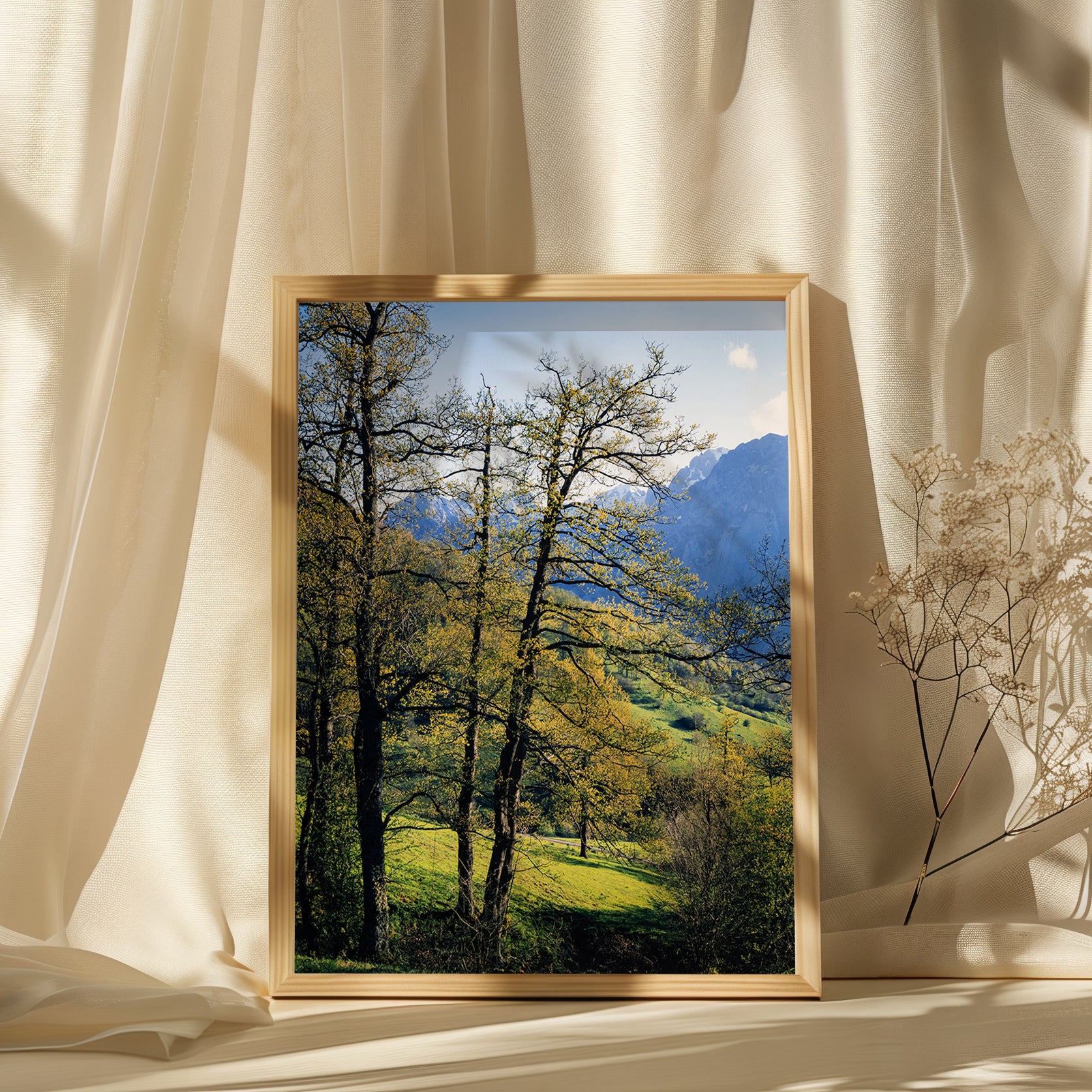 Beneath a clear afternoon sky, the oaks awaken with the season, their fresh leaves glowing gold-green in the sun. The rolling pastures of Sotres spill out beyond the trunks, leading the eye toward the distant, still-snowy peaks of the Picos de Europa.