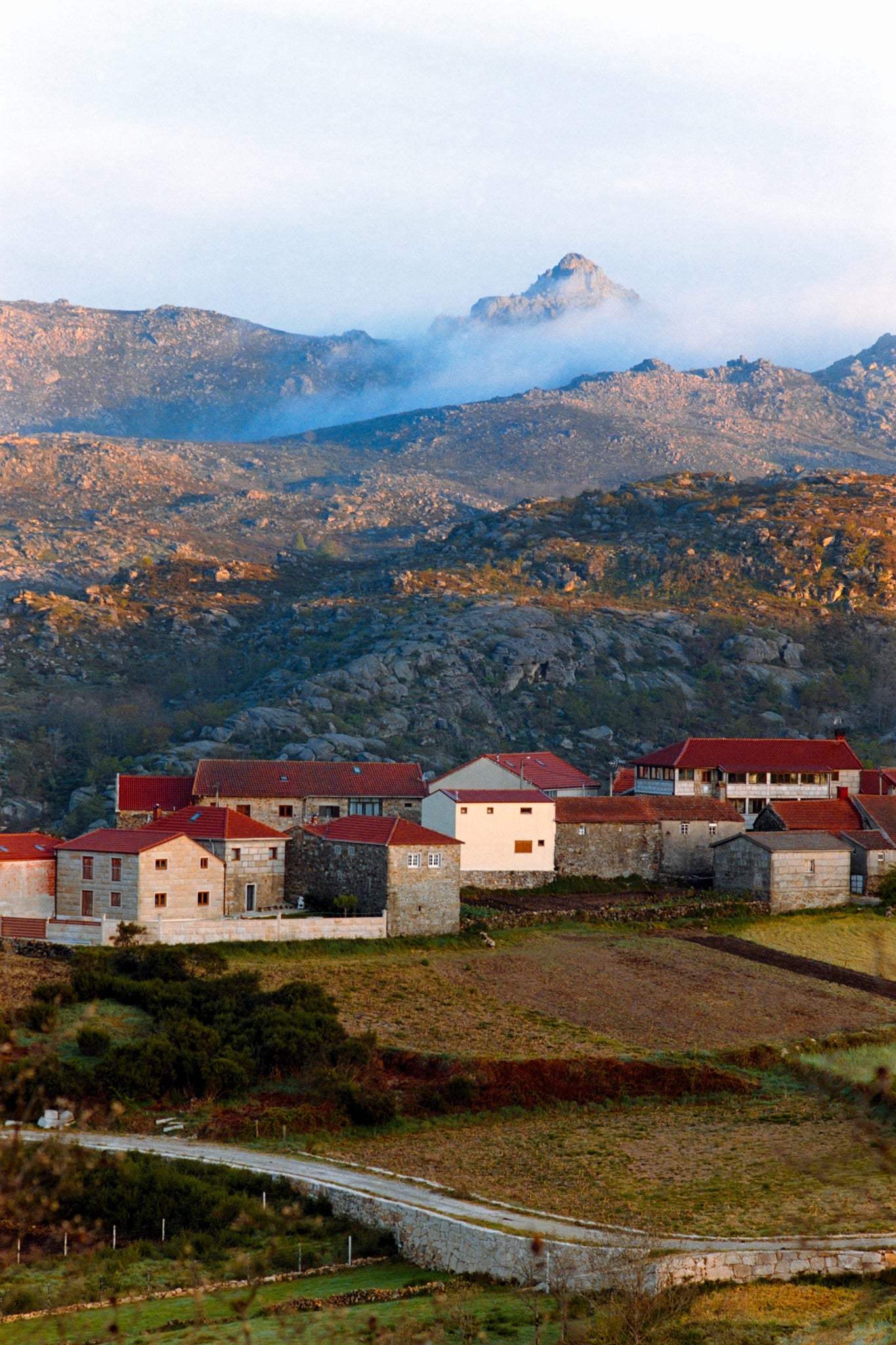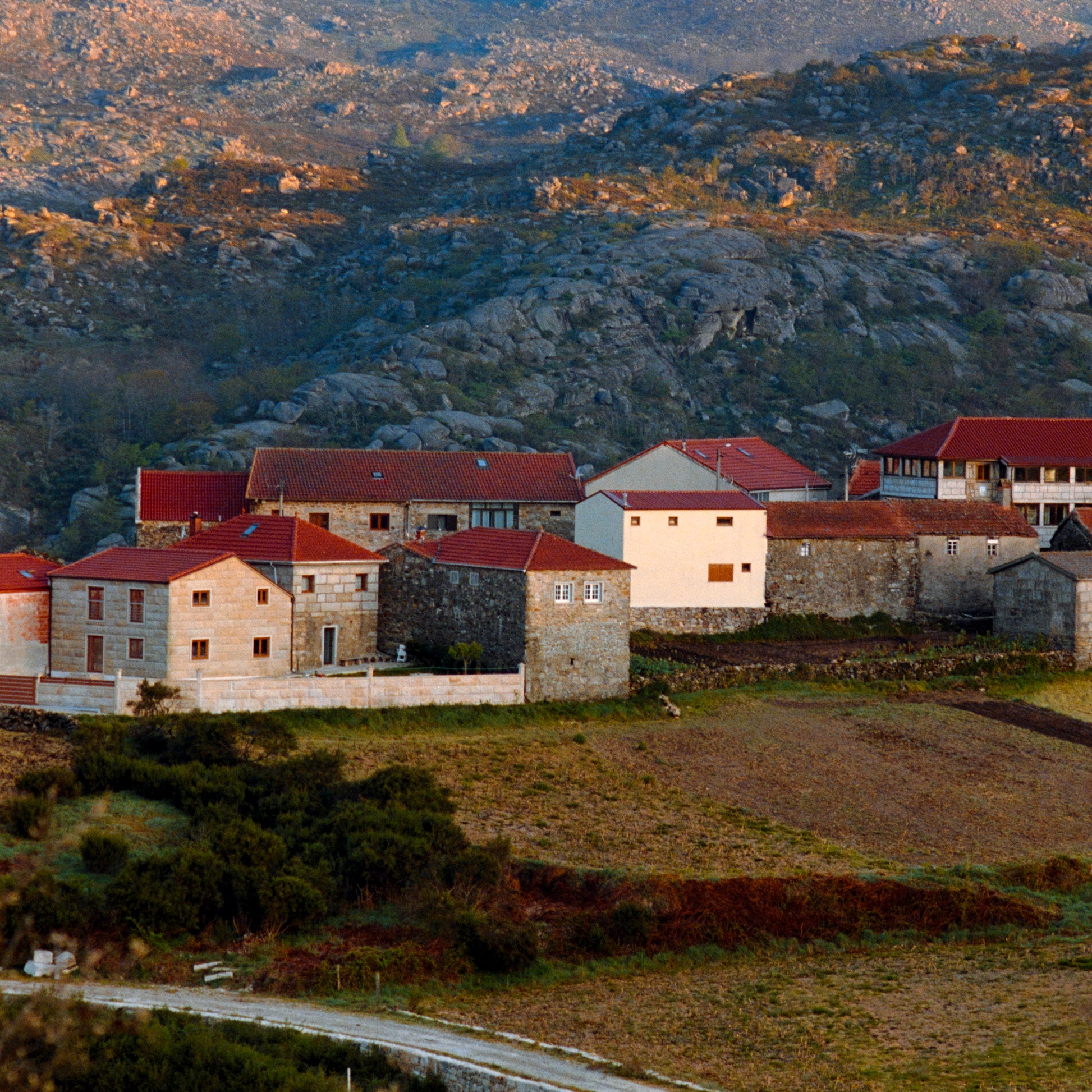 The soft light of dawn touches the quiet village, casting a warm glow over its rooftops. In the distance, a foggy mountain looms, its peak hidden in the morning mist. The scene feels peaceful and still, as the world slowly awakens to the promise of a new day.